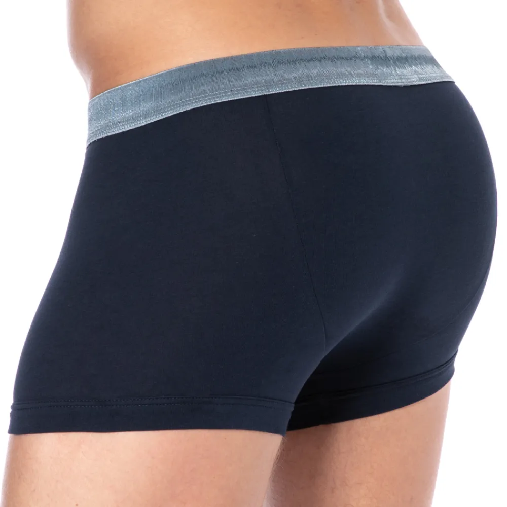 Boxer en coton extensible très doux et confortable. Coupe taille basse, simple et élégante. Poche frontale doublée. Ceinture élastique contrastée brillante signée du monogramme iconique de la marque.