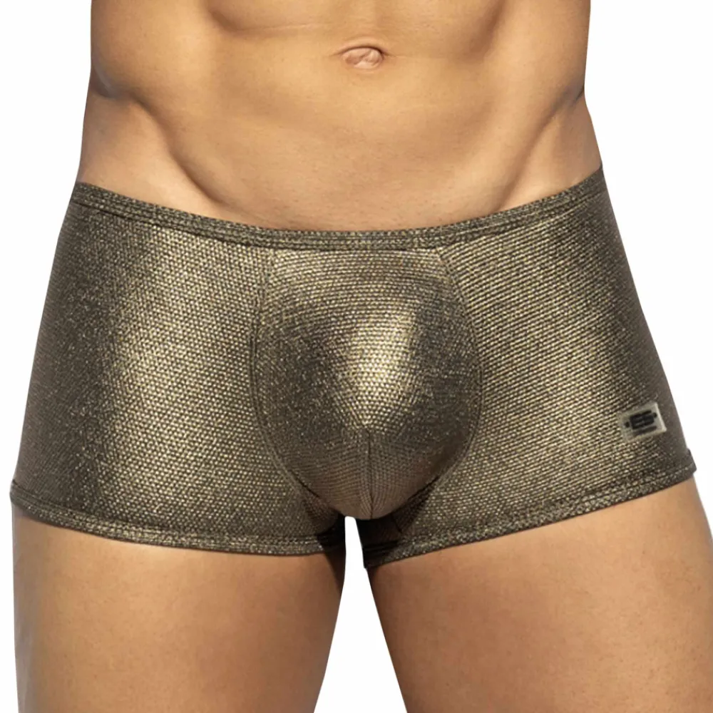 Boxer luxueux en microfibre métallisée brillante. Tissu recyclé, extensible, doux et confortable. Bordures élastiquées. Coupe taille basse ajustée. Etiquette ES Collection en silicone sur la cuisse gauche.