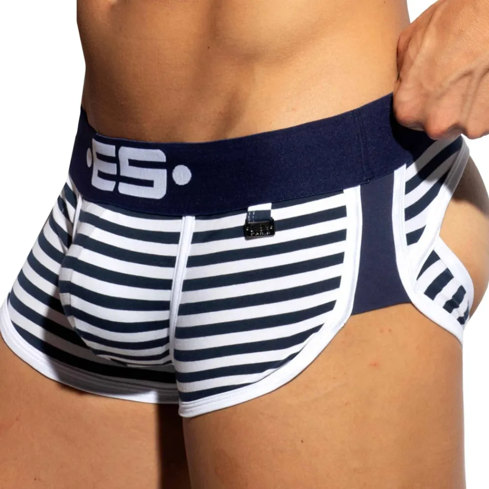 Shorty dont la coupe taille basse parfaitement ajustée a été conçue par Les Dessous d’Apollon. L’arrière a été découpé, à la manière d’un jockstrap, afin d’offrir une totale liberté de mouvement. Poche frontale superbement découpée pour un très grand confort. L’échancrure sur le côté est soulignée par une bande de couleur contrastée. Large ceinture élastique signée ES Collection. Plaque métallique ES Paris en Zamak inoxydable.