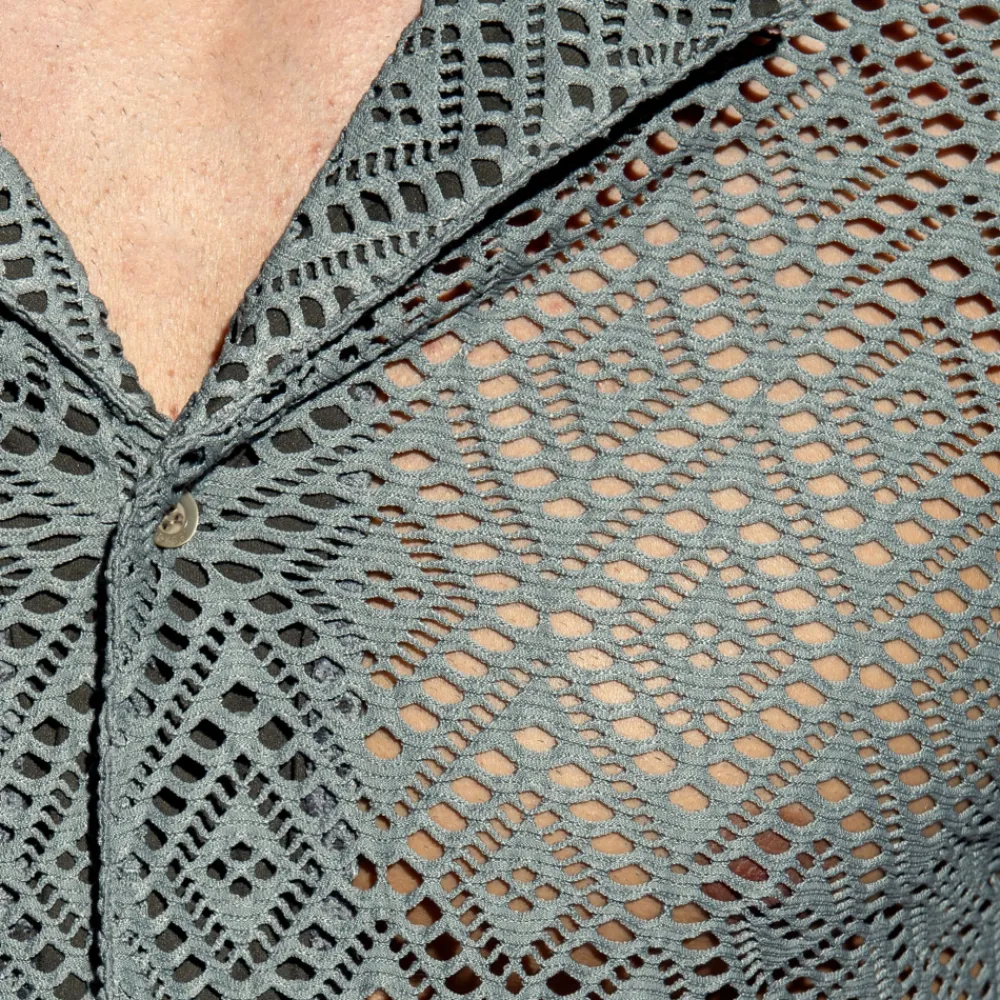Chemisette cintrée, originale et sexy, en tissu transparent, léger et respirant. Motif géométrique ajouré. Matière recyclée à partir de bouteilles plastique. Fermeture 5 boutons. Logo ES Collection en silicone sur la manche gauche.