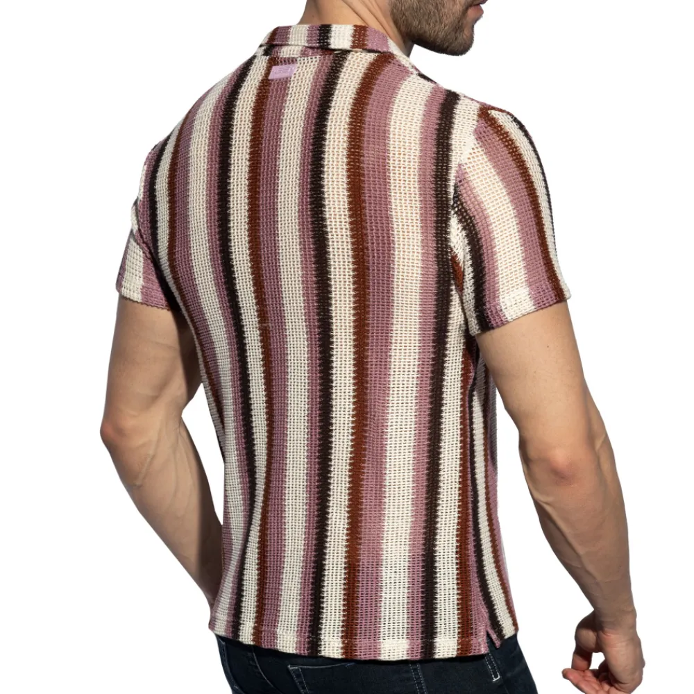 Chemise bohème en coton tricoté à larges mailles, qui ne laisse pas grand chose à l’imagination. Coupe cintrée, col chemise et manches courtes. Fermeture 6 boutons. Etiquette ES Collection en silicone au dos.