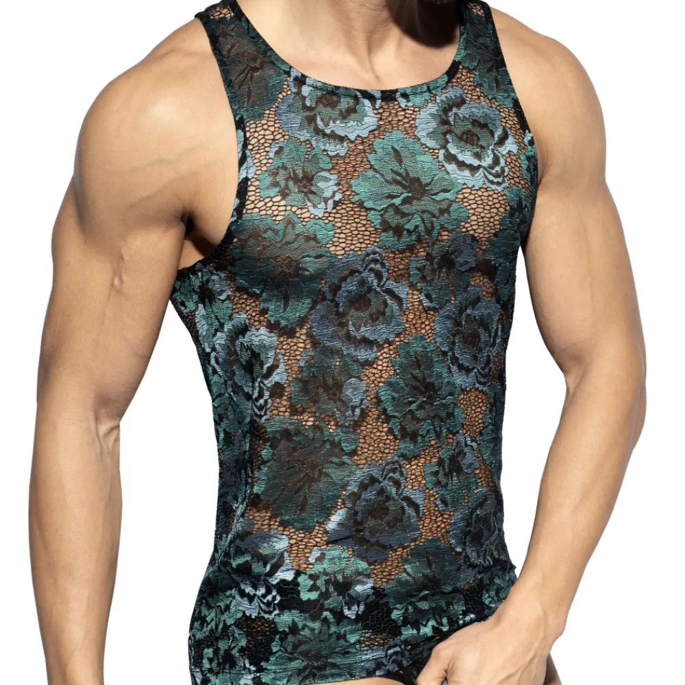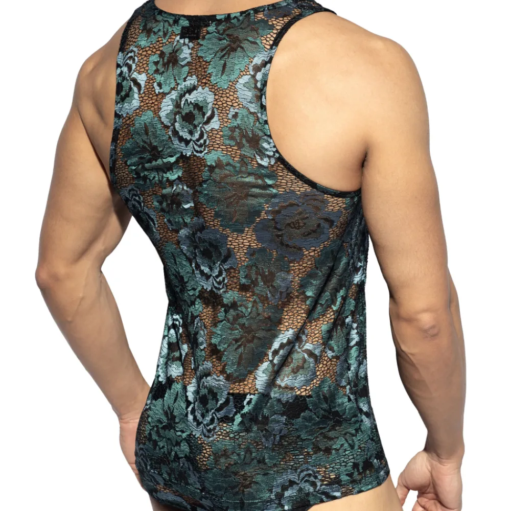 Débardeur luxueux en dentelle transparente décorée d’un délicat motif floral dans les tons verts et bleus. Coupe ajustée et col rond. Logo ES Collection en silicone au dos.