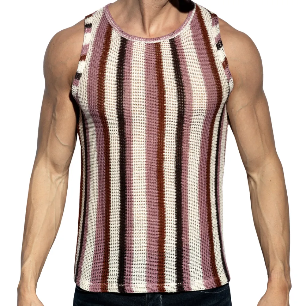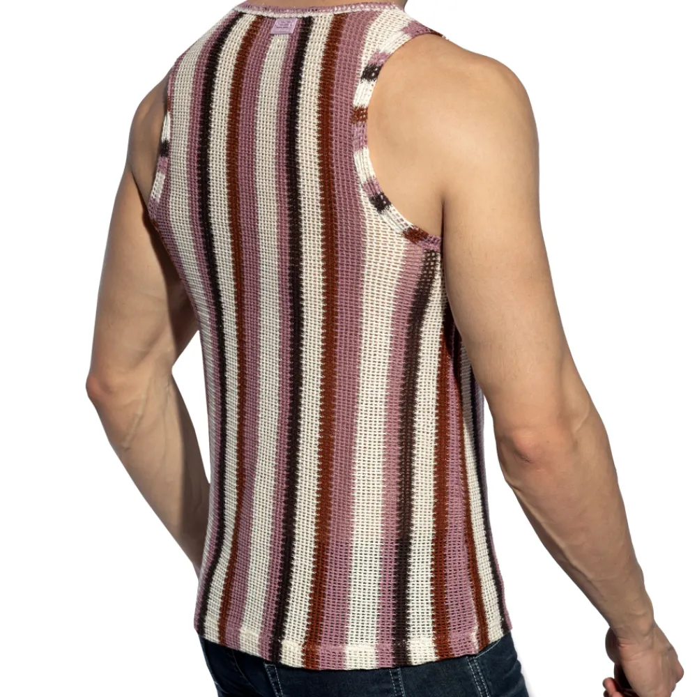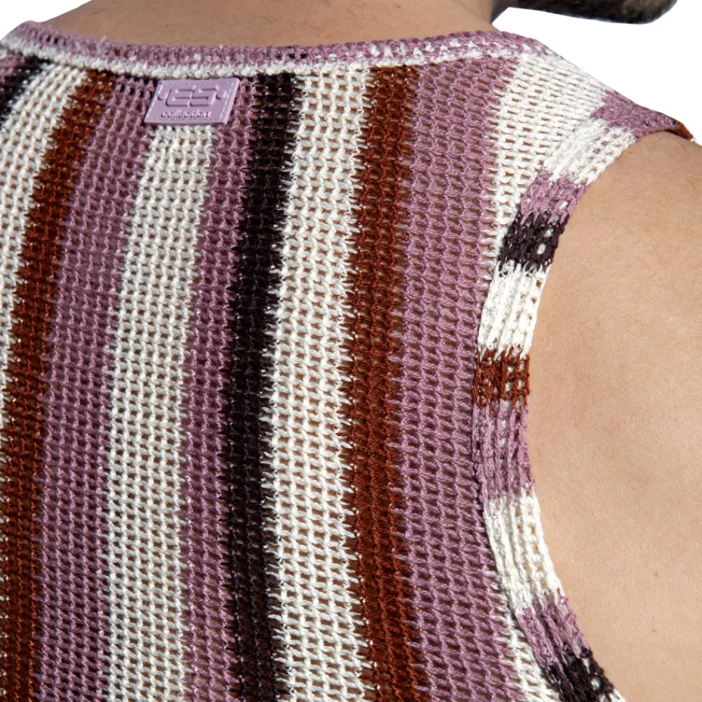 Débardeur bohème en coton tricoté à larges mailles, qui ne laisse pas grand chose à l’imagination. Coupe ajustée et col rond. Etiquette ES Collection en silicone au dos.