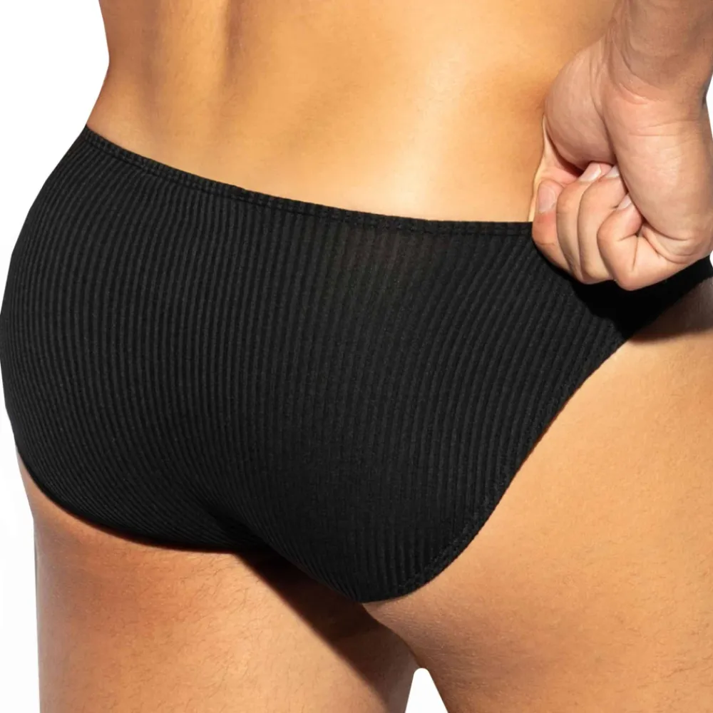 Slip taille basse très sexy en microfibre extensible côtelée et recyclée. Coupe minimaliste très ajustée. Poche frontale moulée sans couture pour un confort optimal. Logo ES Collection en silicone sur la fine ceinture élastique.