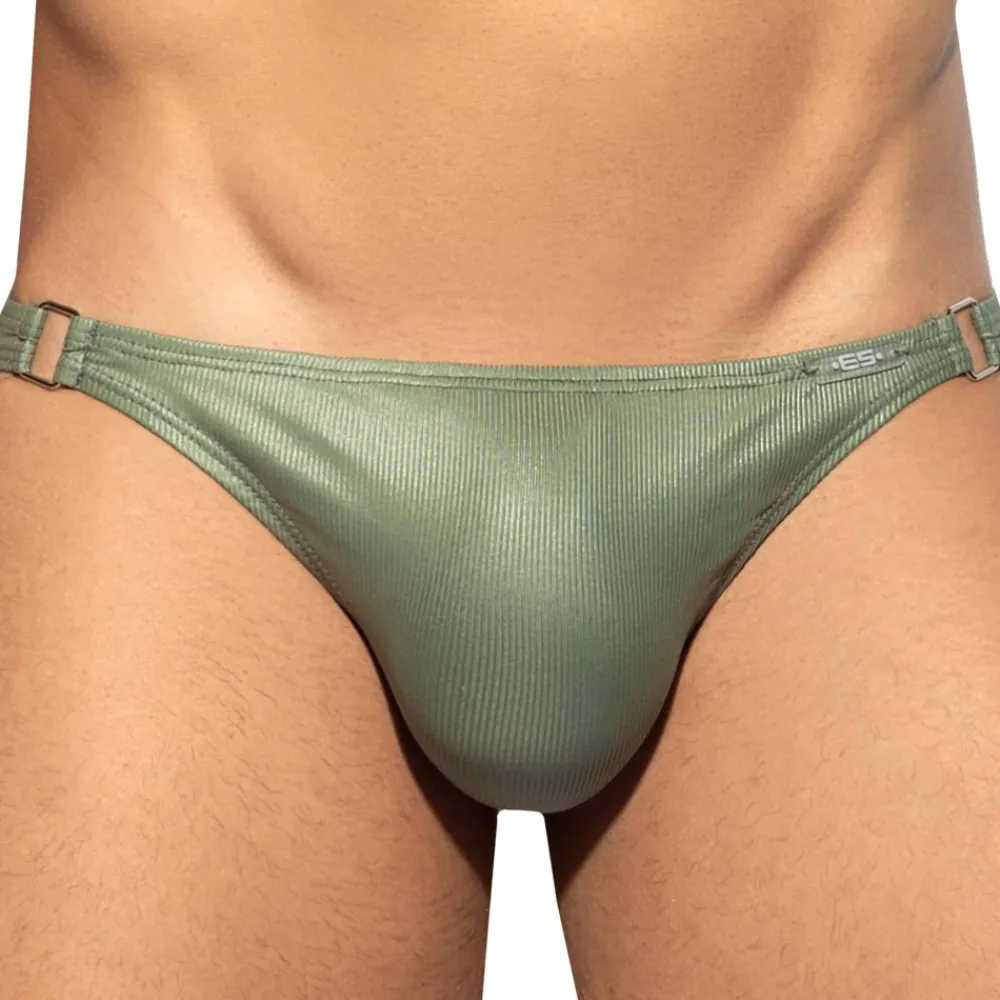 Slip taille basse très sexy en microfibre extensible côtelée. Tissu recyclé et antibactérien. Coupe minimaliste très ajustée. Poche frontale moulée sans couture pour un confort optimal. Boucle métallique de chaque côté. Logo ES Collection en silicone sur la fine ceinture élastique.