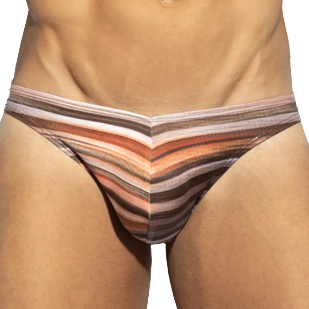 Slip en microfibre extensible, super douce et légère. Finition satinée avec effet liquide. Rayures horizontales. Coupe bikini taille basse, minimaliste et très ajustée. Grande poche frontale non doublée. Etiquette ES Collection en silicone à l’arrière.