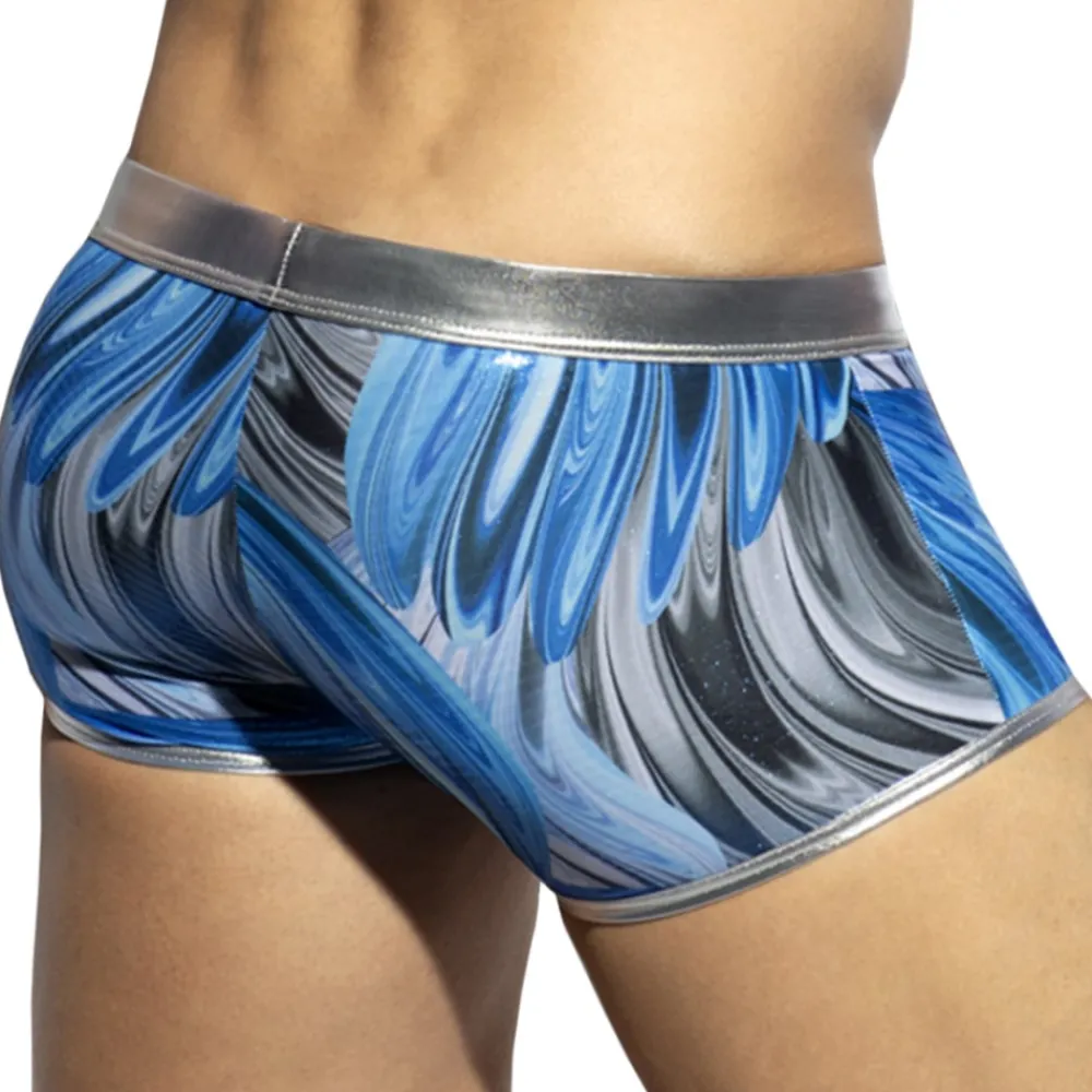 Boxer luxueux en superbe microfibre laminée d’aspect pailleté. Poche frontale de grande capacité. Logo ES Collection en silicone. Ceinture élastique et détails métalliques brillants.