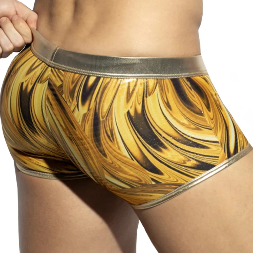 Boxer luxueux en superbe microfibre laminée d’aspect pailleté. Poche frontale de grande capacité. Logo ES Collection en silicone. Ceinture élastique et détails métalliques brillants.