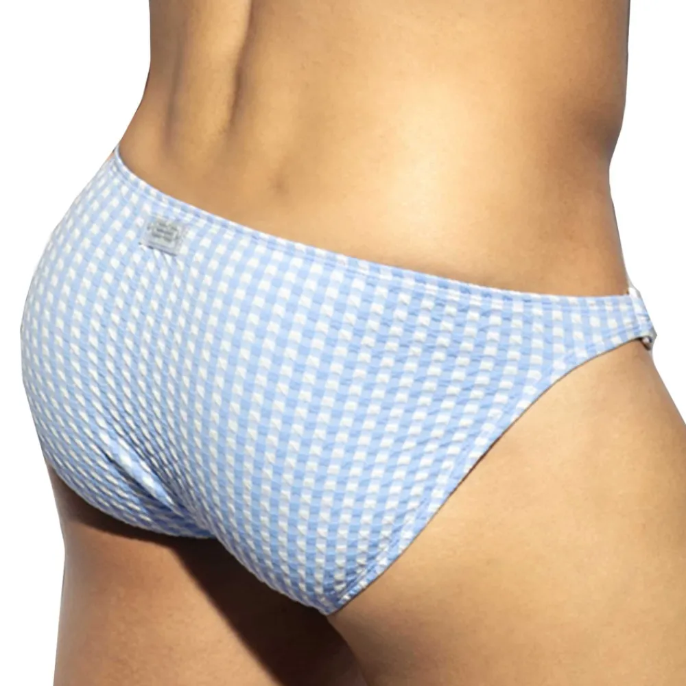 Slip de bain luxueux en microfibre douce et confortable avec effet gaufré et motif à carreaux. Boucles latérales fixant le tissu. Coupe bikini taille basse, minimaliste et très ajustée. Poche frontale moulée sans couture pour un confort optimal. Logo ES Collection en silicone à l’arrière.