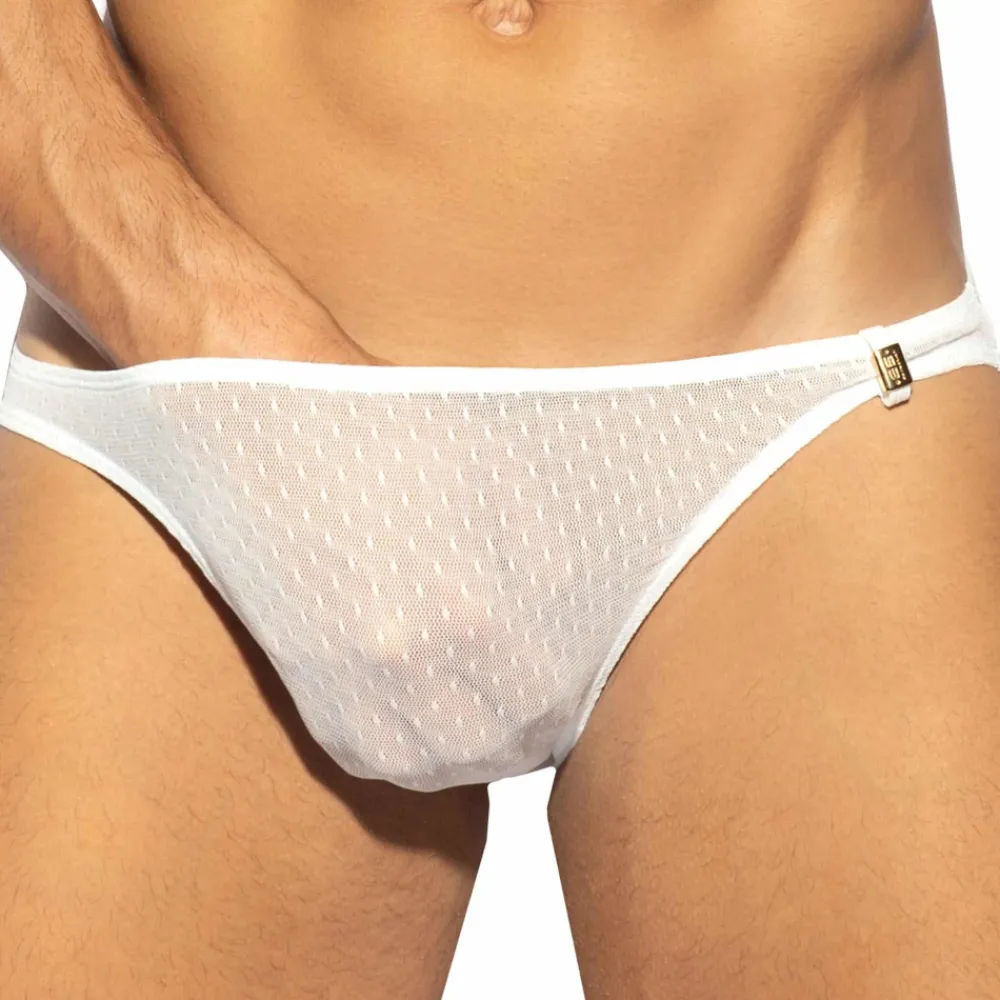 Slip ultra sexy en résille transparente. Coupe taille basse minimaliste. Ceinture élastique signée du logo ES Collection en métal doré.