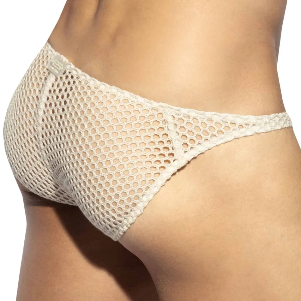 Slip taille basse très sexy en crochet épais à maille large. Tissu tricoté, confortable et luxueux, en pur coton. Non doublé pour une grande transparence. Coupe minimaliste très ajustée. Etiquette ES Collection en silicone en haut des fesses.