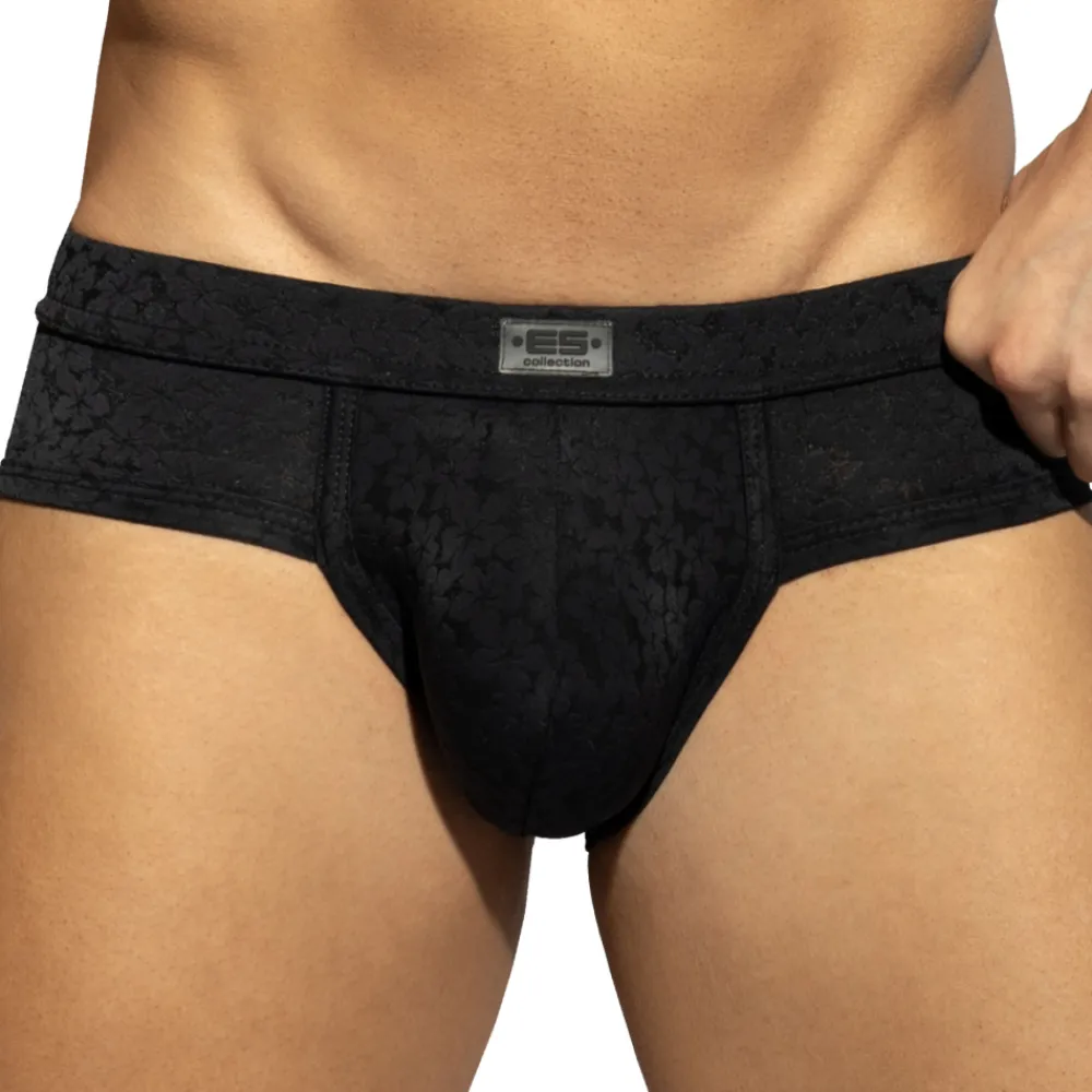 Slip en voile extensible légèrement transparent. Motif floral discret et élégant façon dentelle. Coupe taille basse et ajustée. Ceinture élastique signée ES Collection.