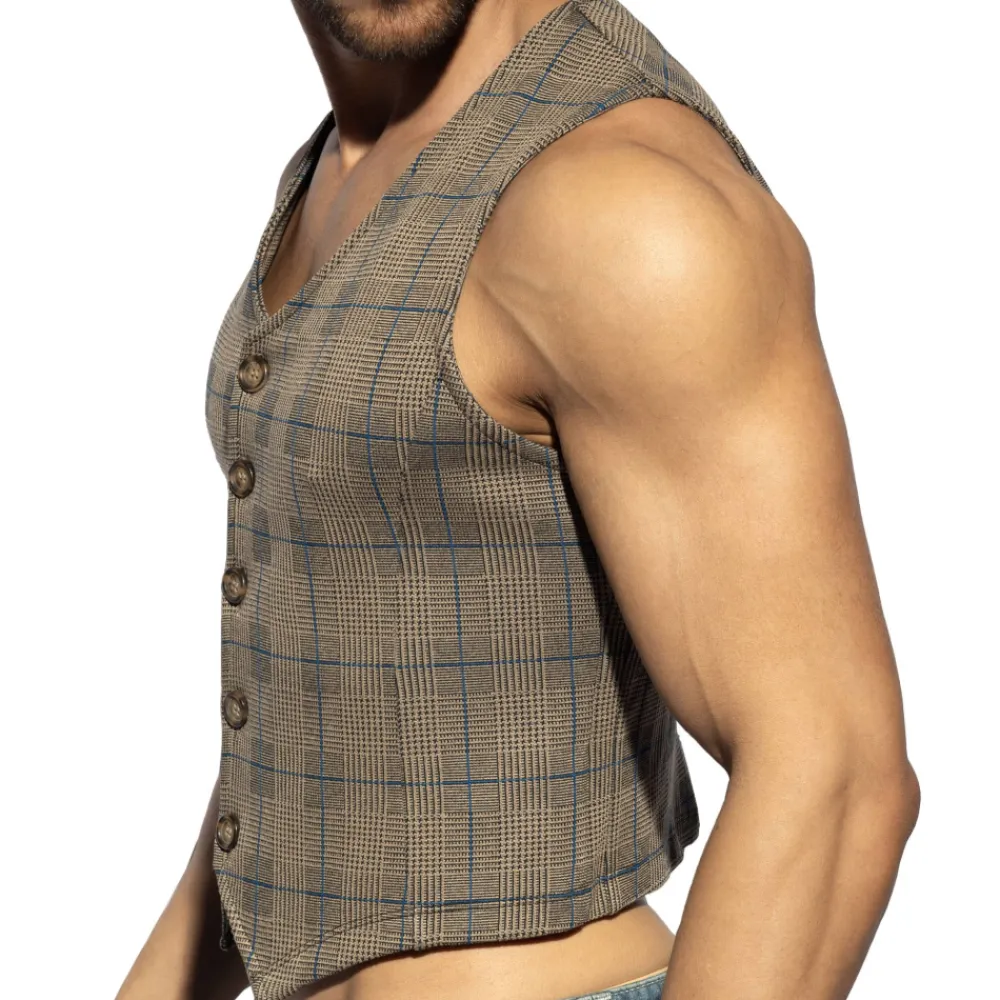 Gilet sans manches, élégant et original, en tissu stretch. Motif tartan très tendance. Coupe cintrée. Fermeture 5 boutons. Logo ES Collection en silicone dans le dos.