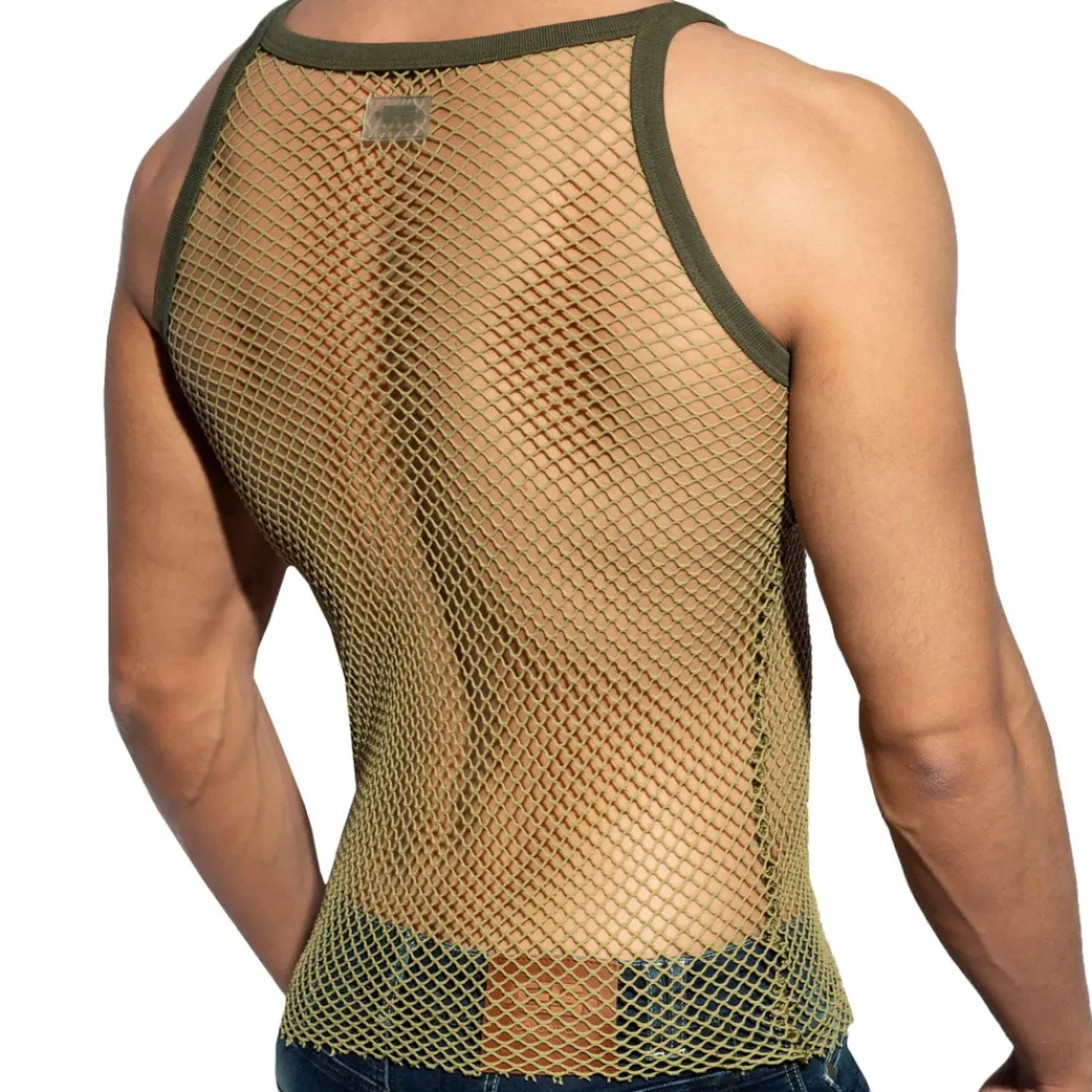 Débardeur très sexy en résille extensible et robuste à maillage large, façon filet de pêche. Coupe ajustée avec col carré. Fines bretelles. Etiquette ES Collection en silicone dans le dos.