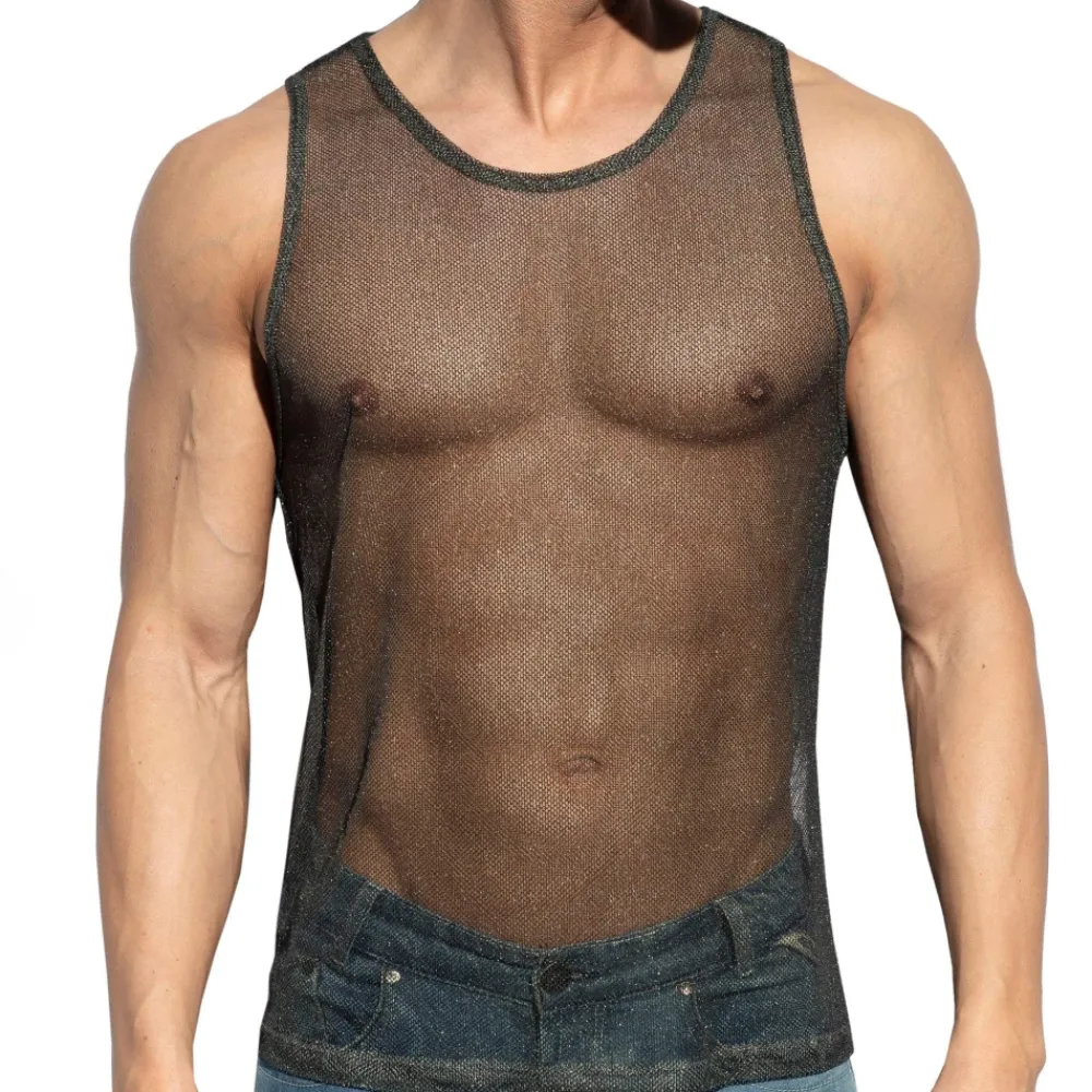Débardeur luxueux et délicat en résille scintillante, conçue avec des fils métalliques. Coupe très ajustée. Etiquette ES Collection en silicone en haut du dos.