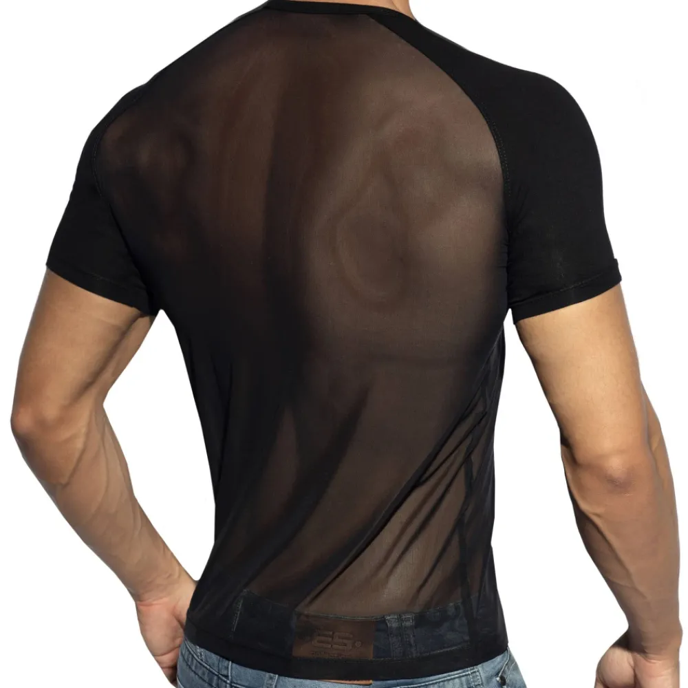 T-shirt sexy en résille extensible transparente. Matière douce et respirante. Manches courtes opaques. Logo ES Collection en silicone sur la poitrine.