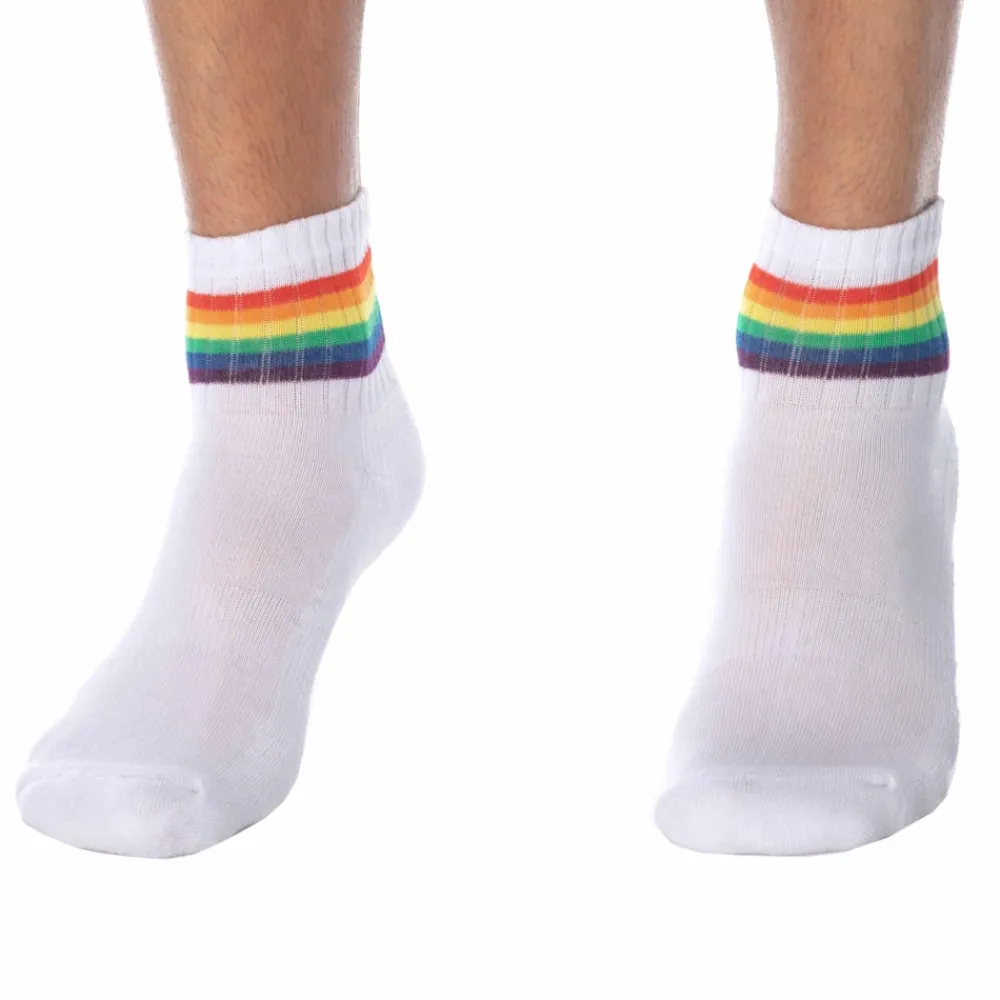 Socquettes en coton tricoté doux et confortable. Rayures aux couleurs de l’arc-en-ciel. Semelle entièrement renforcée en finition bouclette. 2 tailles : 39-42 et 43-46. Fabrication 100% française.