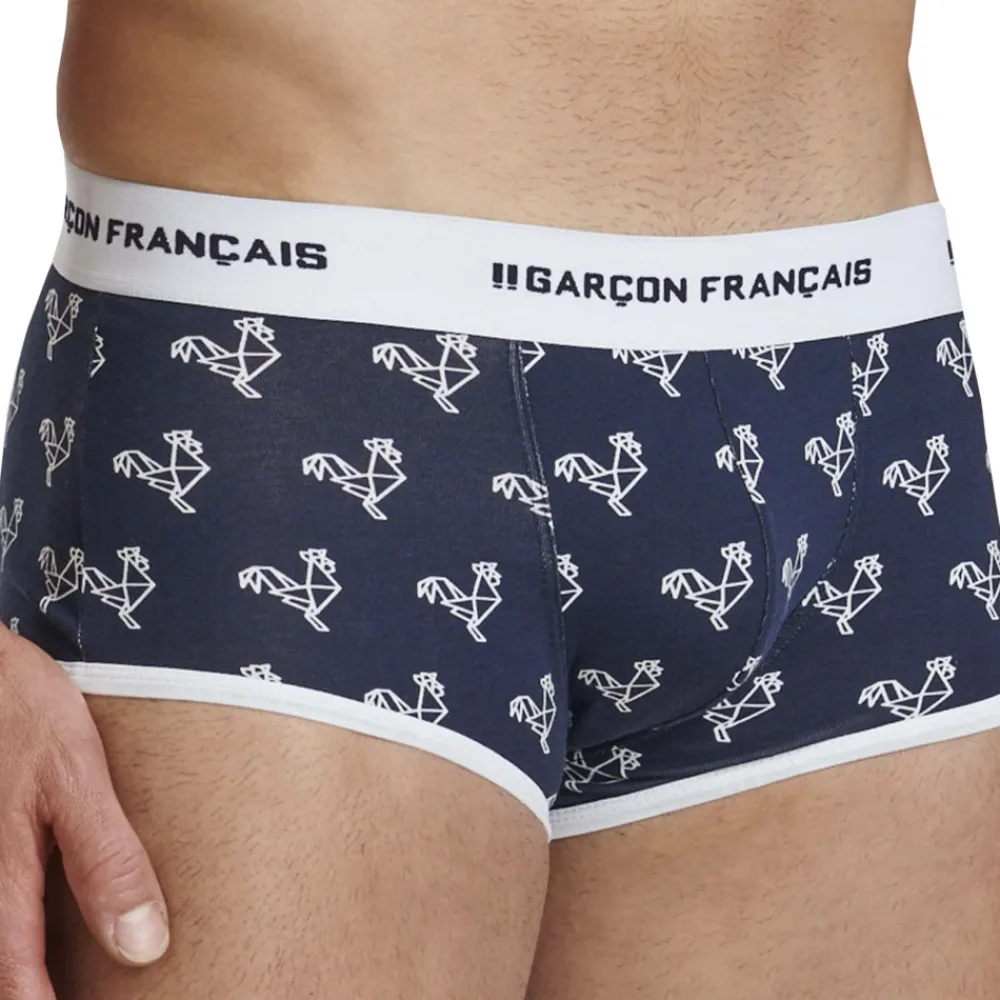 Boxer taille basse très ajusté en coton doux, souple et confortable. Imprimé original constitué de coqs en origami. Belle ceinture Garçon Français. Fabrication 100% française.