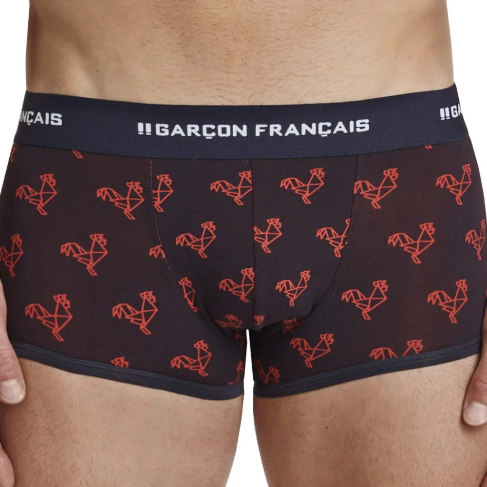 Boxer taille basse très ajusté en coton doux, souple et confortable. Imprimé original constitué de coqs en origami. Belle ceinture Garçon Français. Fabrication 100% française.