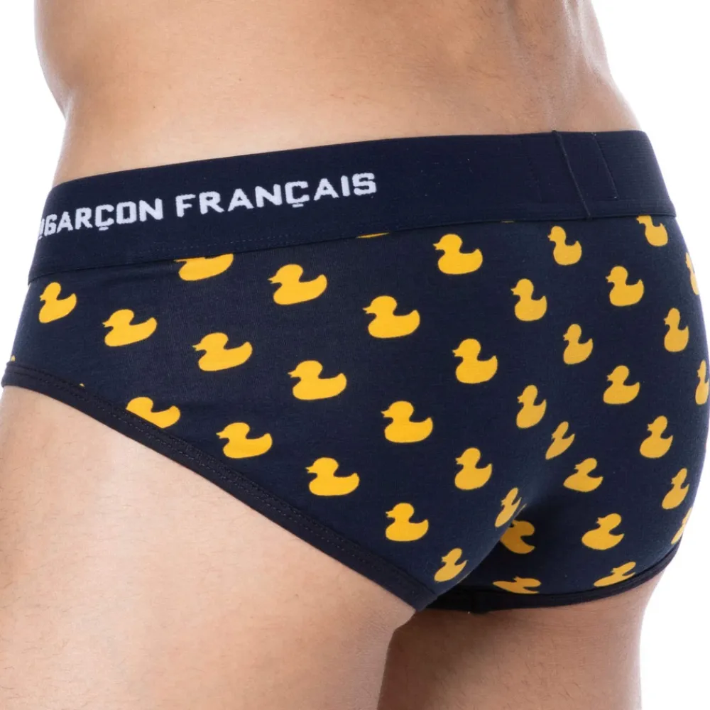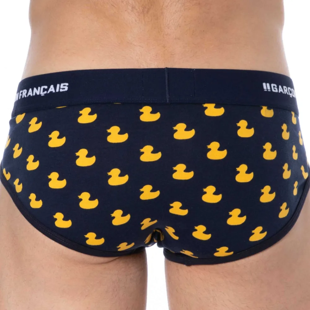 Slip taille basse très ajusté en coton doux, souple et confortable. Imprimé canards très original. Belle ceinture Garçon Français. Fabrication 100% française.