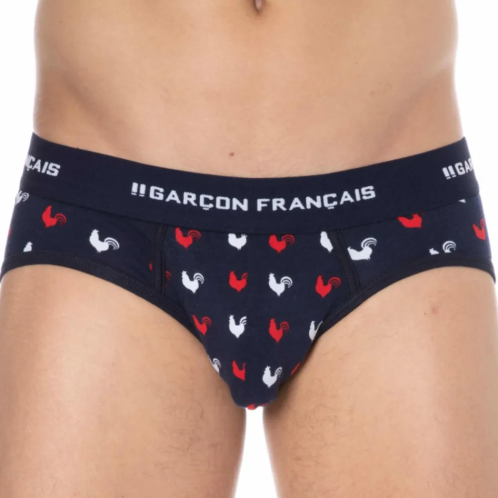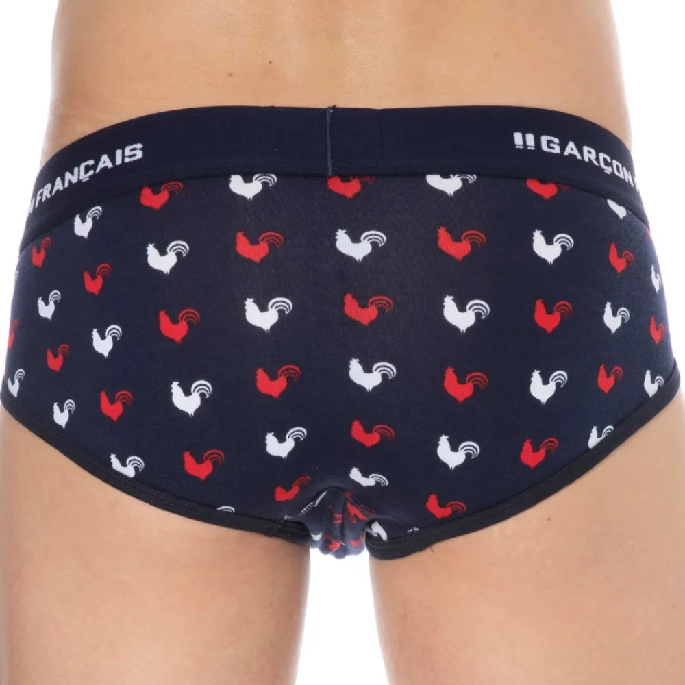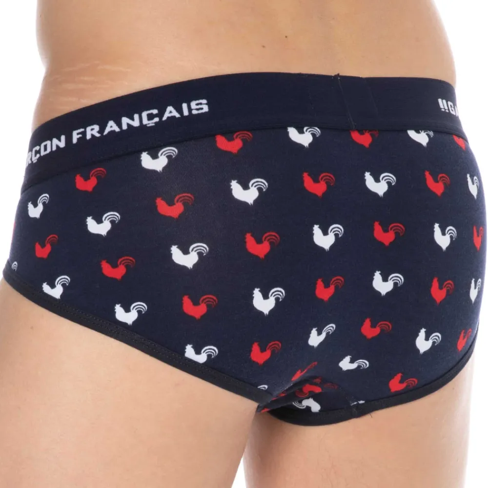 Slip taille basse très ajusté en coton doux, souple et confortable. Imprimé coqs gaulois. Belle ceinture Garçon Français. Fabrication 100% française.