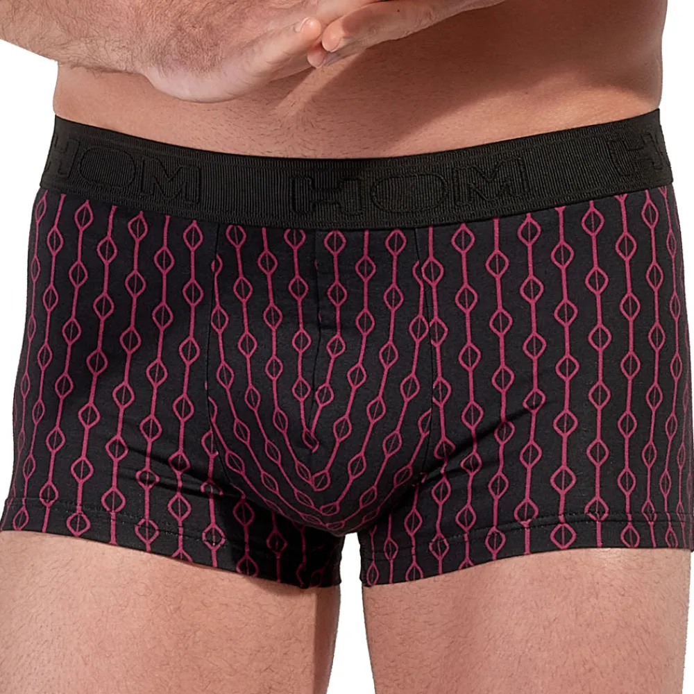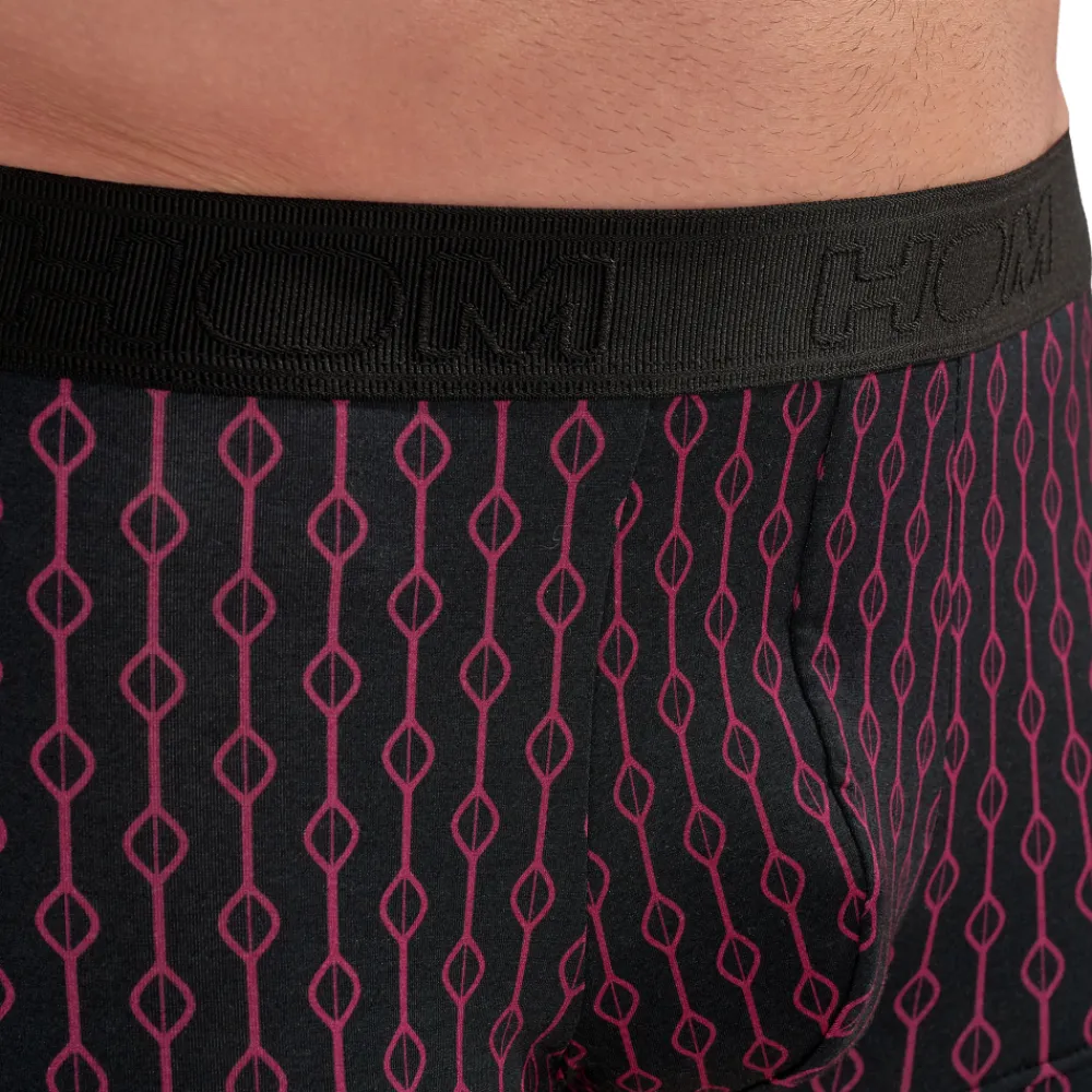 Boxer en mélange de coton et de modal extensible, ultra doux et confortable. Motif géométrique bordeaux sur fond noir, inspiré des années 50 et de l’Hôtel Dunes à Las Vegas. Tissu de qualité supérieure certifié Oeko-Tex. Poche frontale doublée. Ceinture élastique signée HOM.