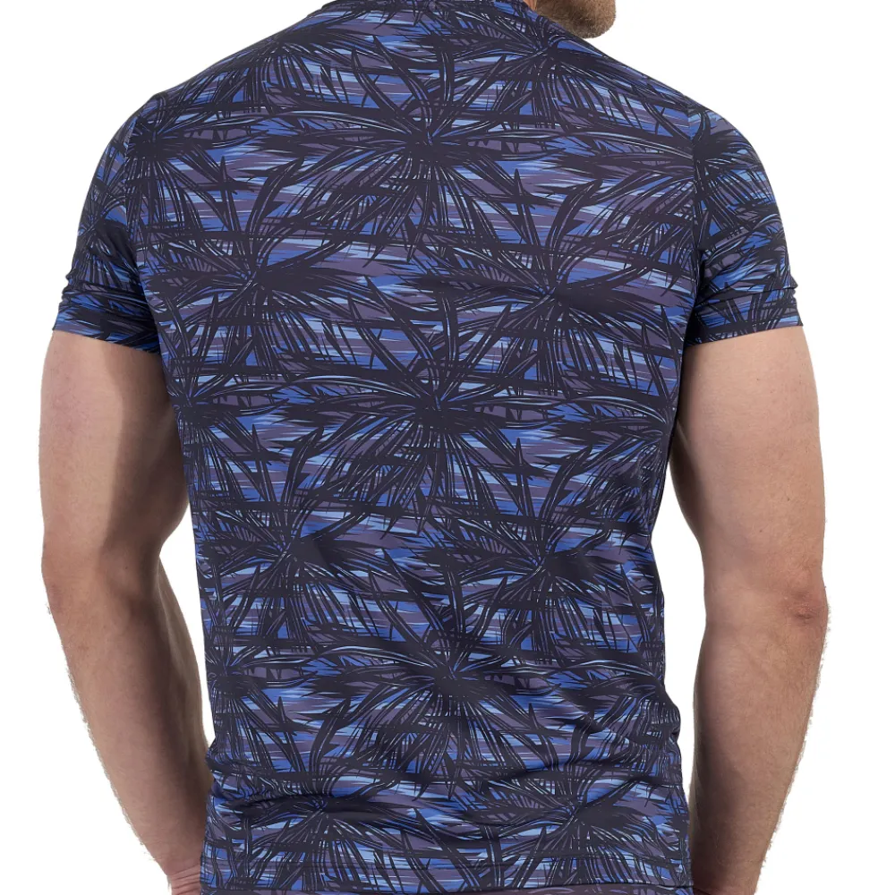 T-shirt confortable en microfibre extensible, ultra douce et confortable. Motif végétal noir évoquant les palmiers de Las Vegas, sur un fond bleu dégradé. Col V et manches courtes. Tissu de qualité supérieure certifié Oeko-Tex.