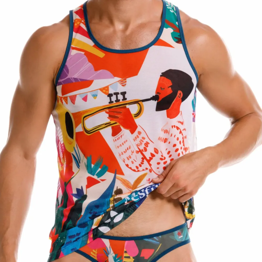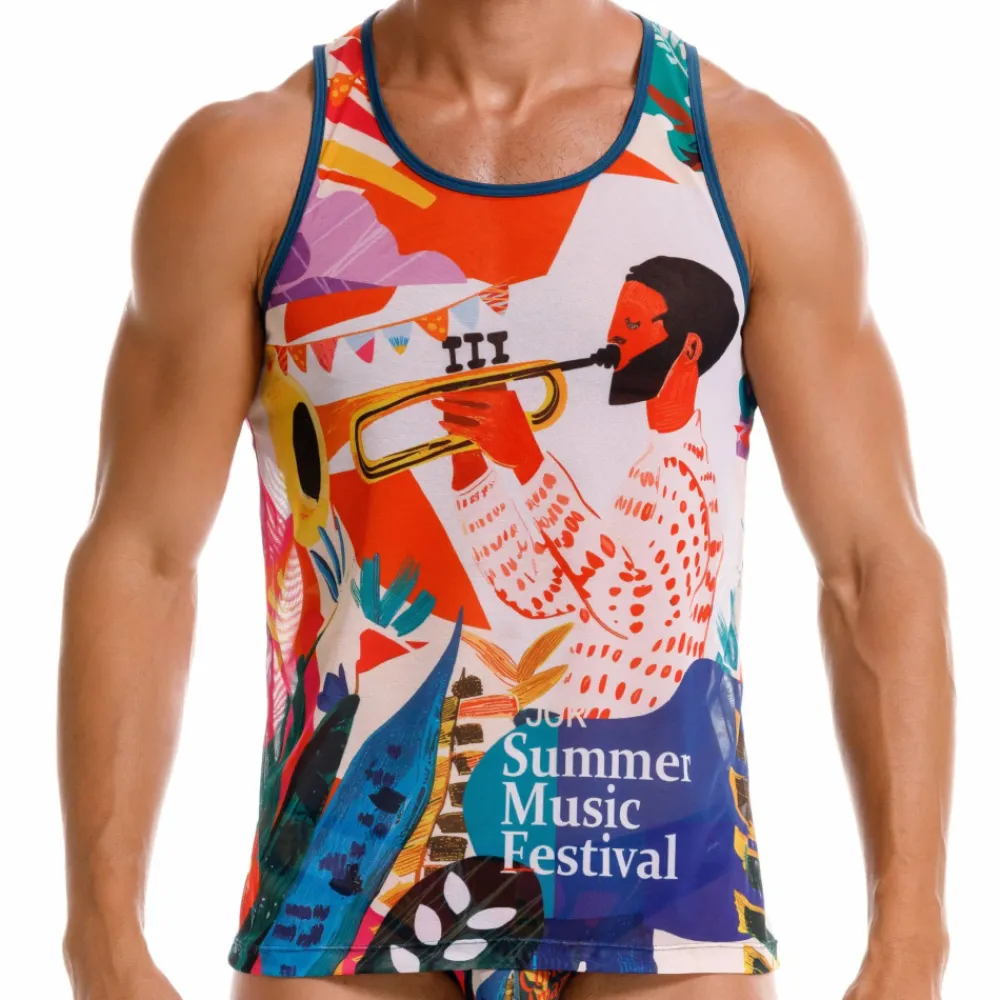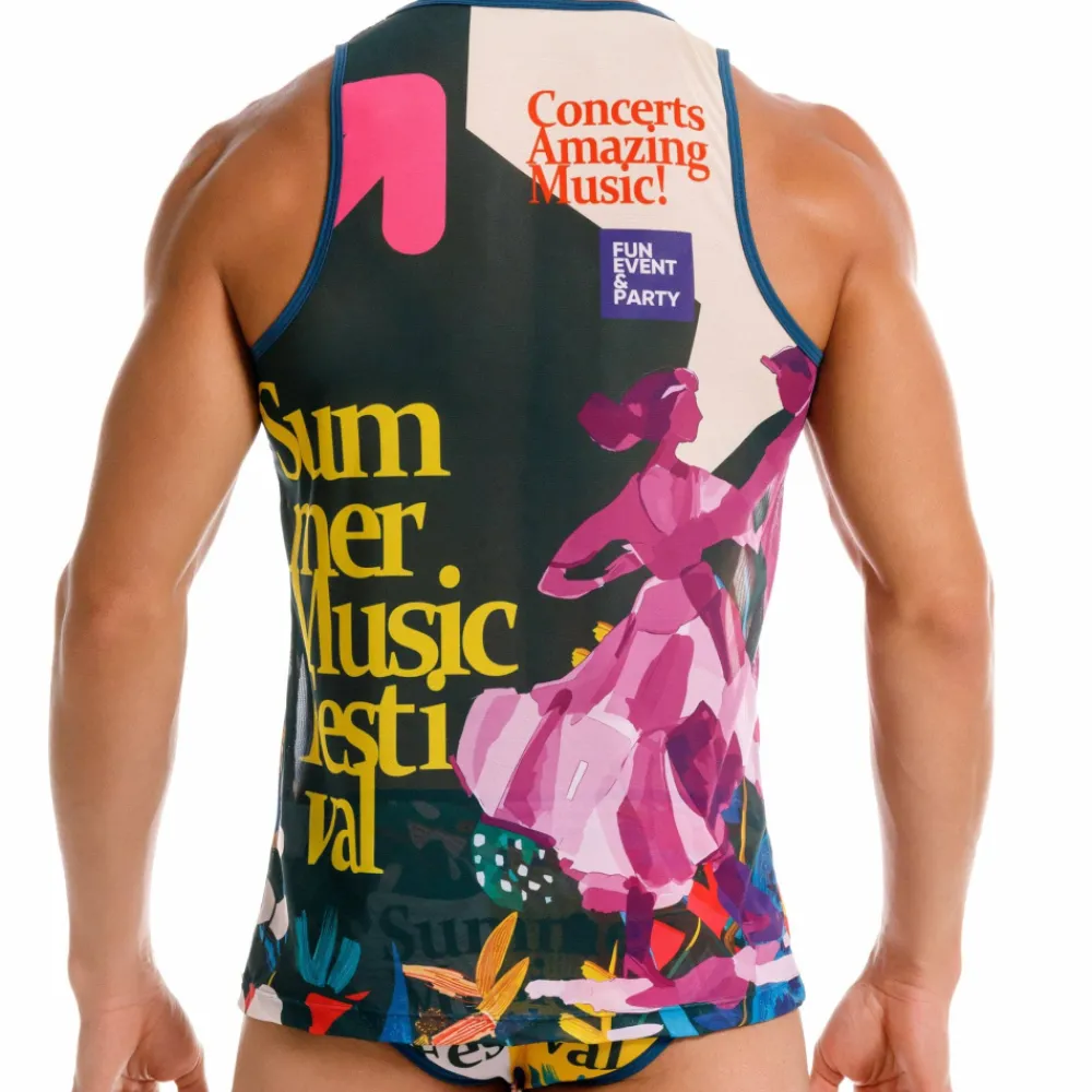 Débardeur semi-transparent en microfibre extensible, super douce et légère. Imprimé festif évoquant les festivals musicaux de l’été.