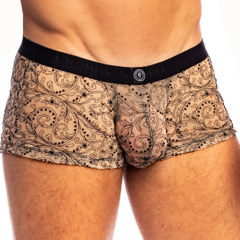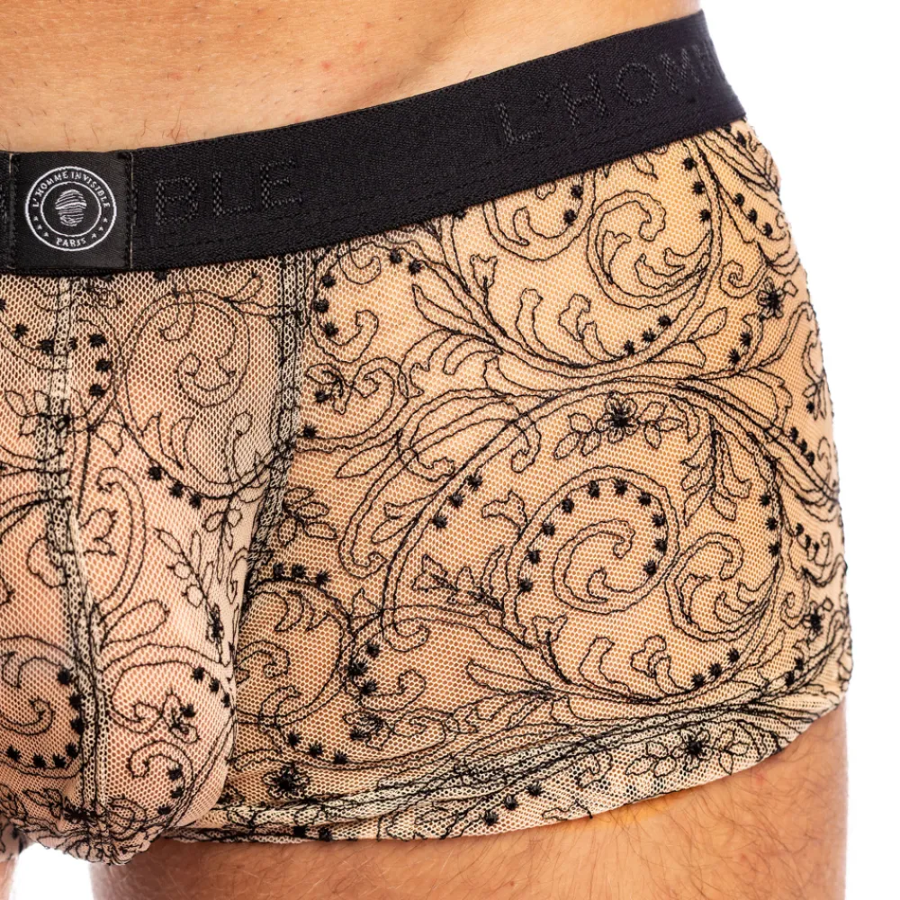 Shorty luxueux et raffiné en fine résille couleur chair, délicate et semi-transparente. Tissu brodé d’un motif baroque sophistiqué qui dessine comme un tatouage à même la peau. Poche frontale ergonomique push up non doublée. Absence de couture à l’arrière et sur les côtés, pour un effet seconde peau. Ceinture élastique contrastée signée L’Homme Invisible.