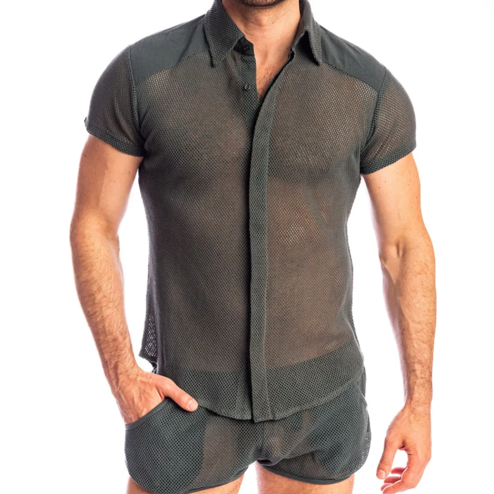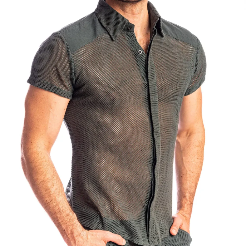 Chemise en résille de coton transparente. Coupe cintrée arrondie en bas. Manches courtes. Patte de boutonnage invisible. Empiècement opaque en haut du dos avec logo L’homme Invisible.