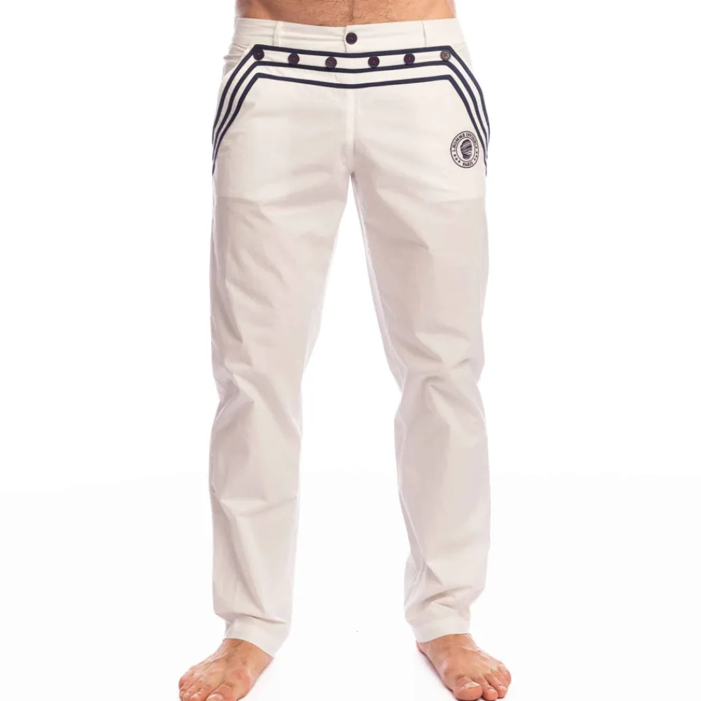 Pantalon inspiré du style matelot, en coton léger et confortable. Coupe taille basse ajustée. Boutonnage horizontal fonctionnel devant, souligné par des rayures façon marinière. 4 poches. Ancre brodée sur la poche arrière droite. Ceinture élastiquée avec passants et braguette 2 boutons.