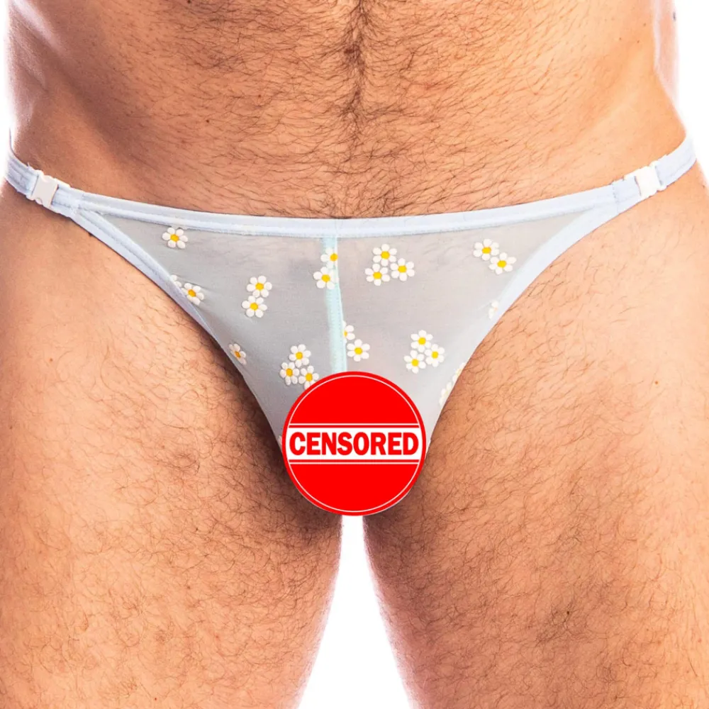 String sensuel et romantique en tulle transparent de confection italienne. Paquerettes floquées. Coupe minimaliste avec clips fonctionnels. Poche frontale non doublée. Design en Y à l’arrière pour mettre en valeur votre fessier.