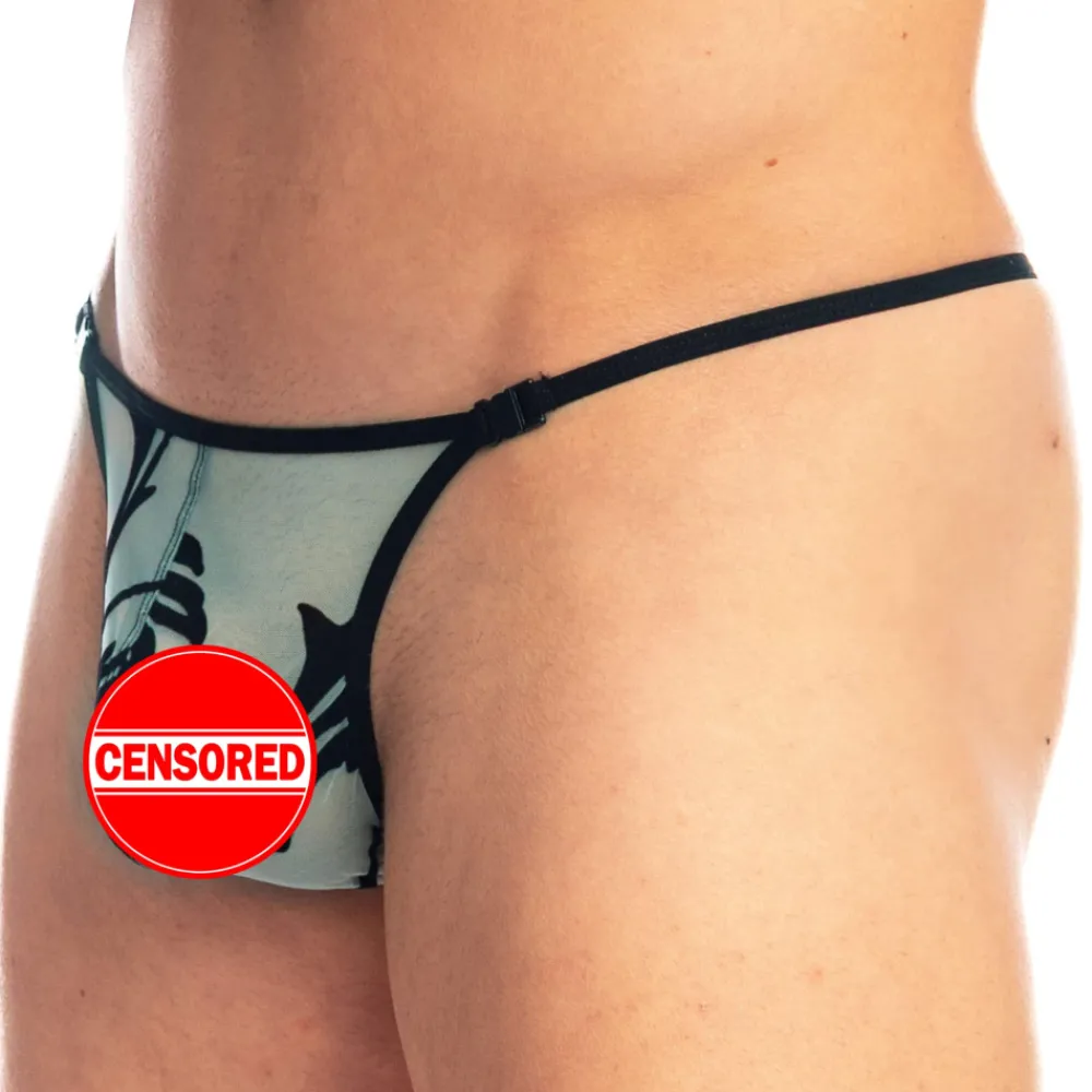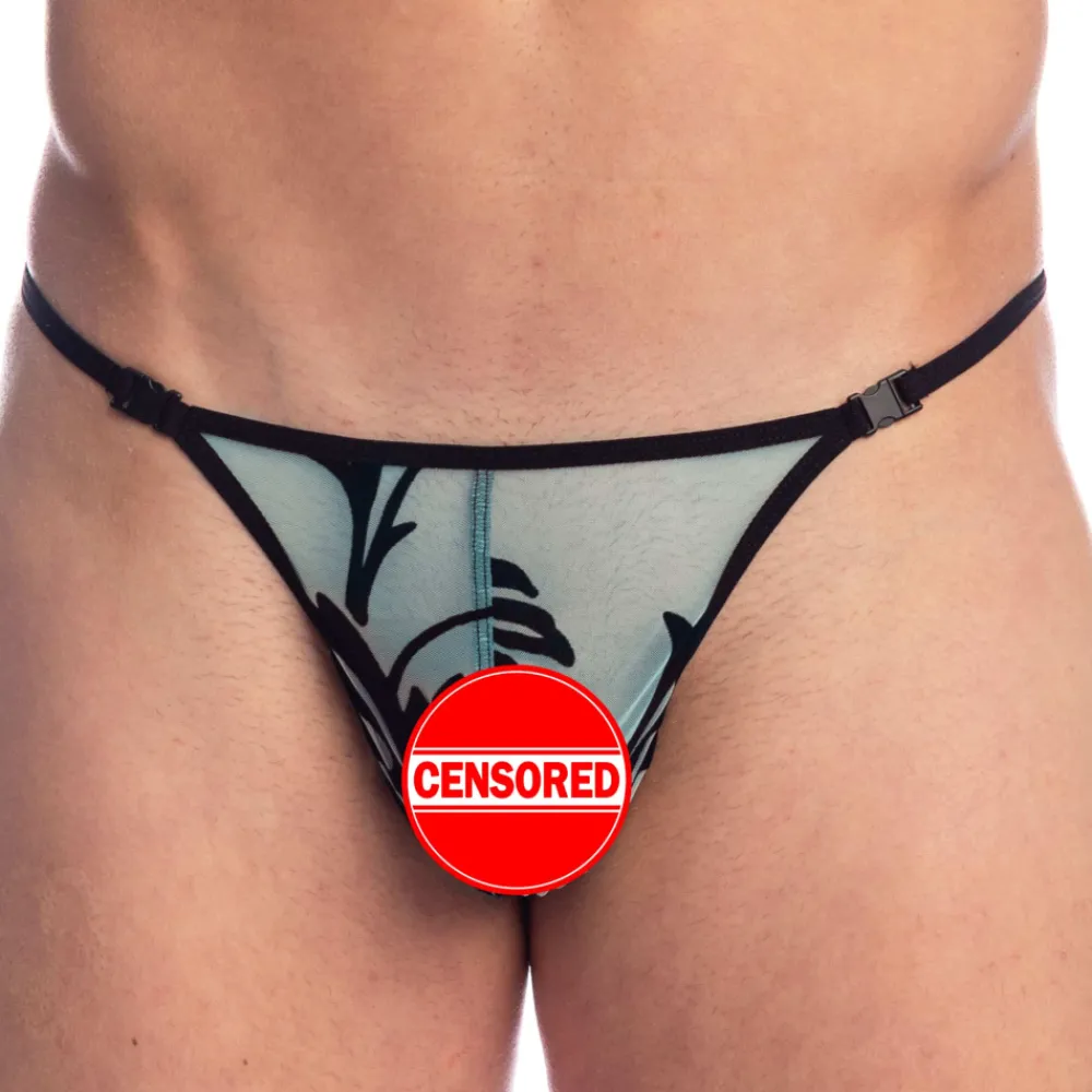 String sexy et très sensuel en tulle transparent floqué de motifs baroques en velours noir. Coupe minimaliste avec clips fonctionnels. Poche frontale ergonomique, non doublée. Design en Y à l’arrière pour mettre en valeur votre fessier.
