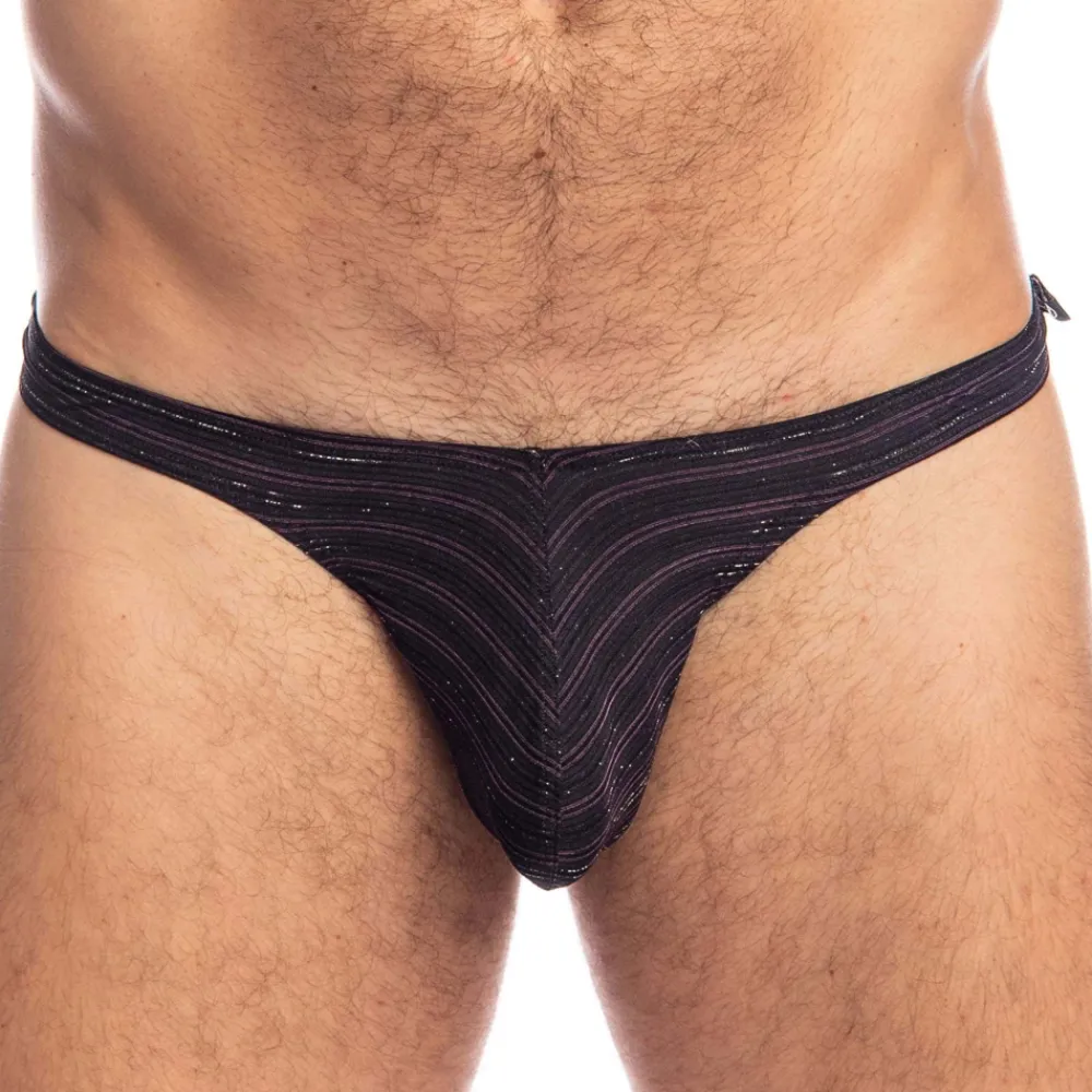 String glamour et élégant en tissu ultra soyeux, léger et confortable. Fines rayures qui mettent en valeur les formes du corps. Fils métallisés Lurex pour un subtil effet pailleté. Coupe minimaliste taille basse. Poche frontale ergonomique non doublée. Bordures contrastées.