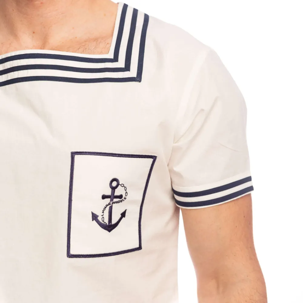 T-shirt inspiré du style matelot, en coton léger et confortable. Manches courtes et col carré soulignés par des rayures façon marinière. Ancre brodée sur la poitrine.