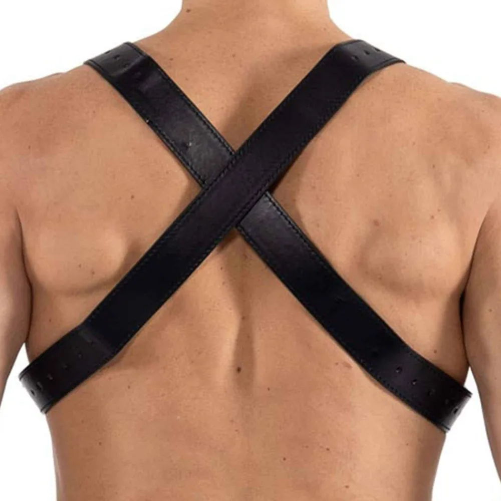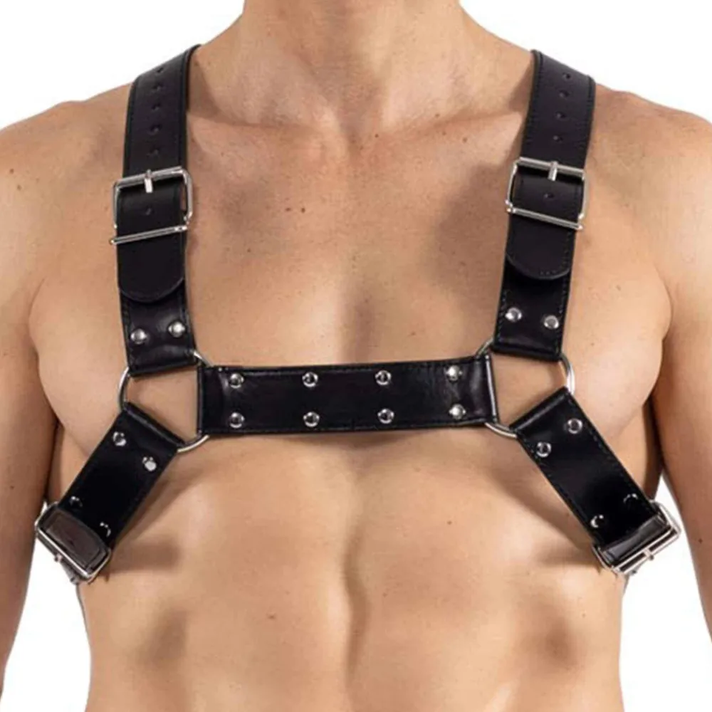Harnais en simili cuir avec rivets métalliques plats, parfait pour un look très fetish. 2 sangles ajustables croisées dans le dos et reliées par 2 anneaux métalliques. Taille unique.