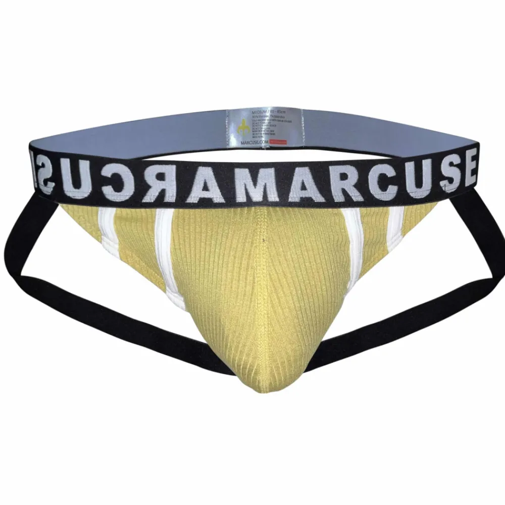 Jockstrap confortable en tissu côtelé extensible, ultra-doux, léger et respirant. Coupe super taille basse et très ajustée. Deux bandes sport contrastées sur les côtés. Ceinture élastique signée Marcuse.