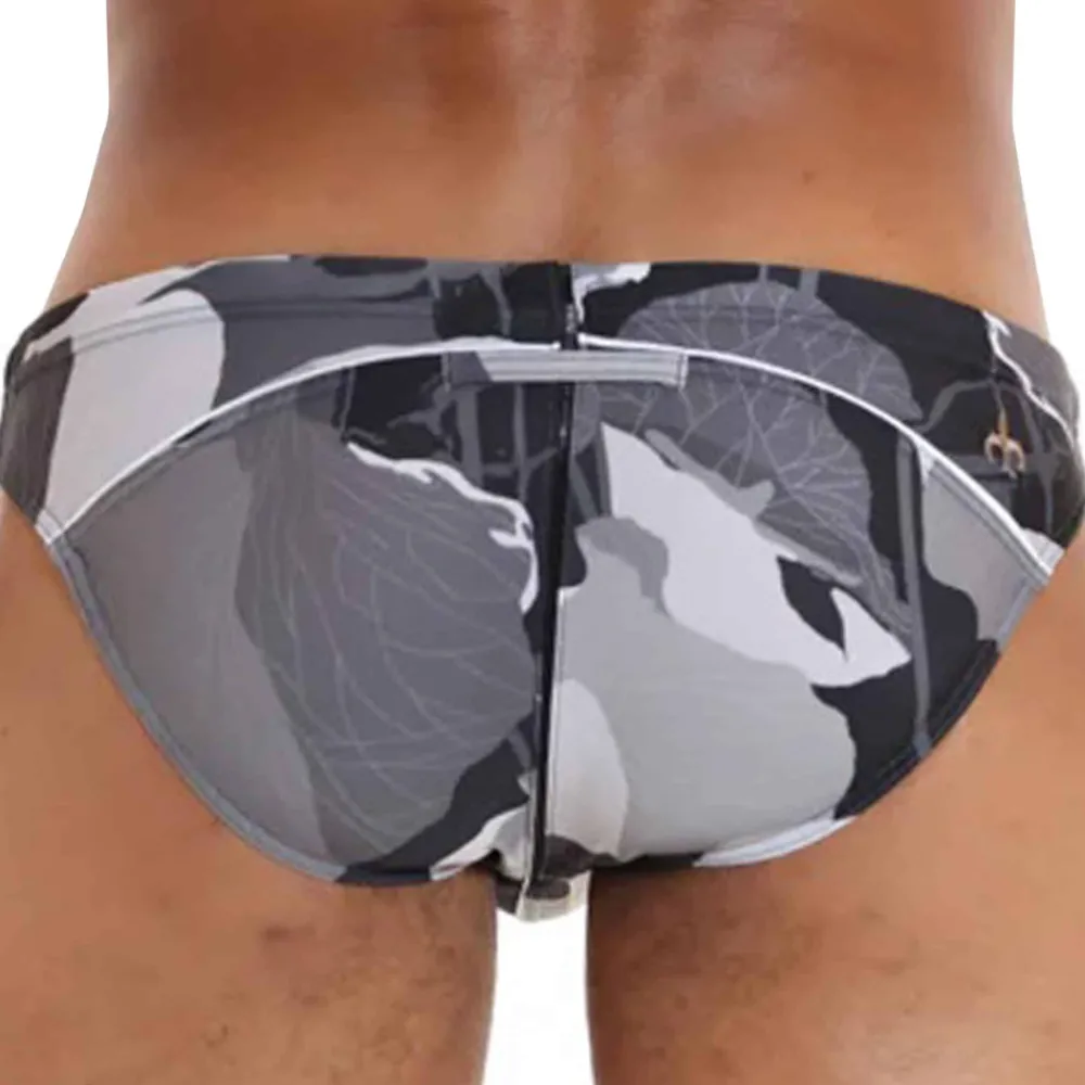 Slip de bain super taille basse en microfibre italienne extensible, douce et confortable. Tissu de qualité premium résistant à l’eau de mer, au chlore et aux UV. Imprimé camouflage tendance et original. Poche frontale 3D non doublée. Ceinture élastique avec cordon de serrage intérieur. Logo Marcuse brodé devant et derrière.