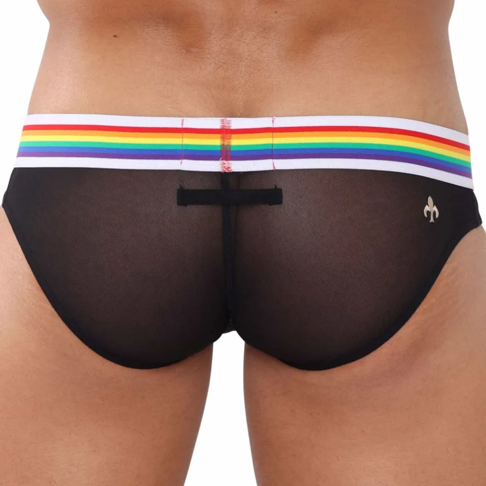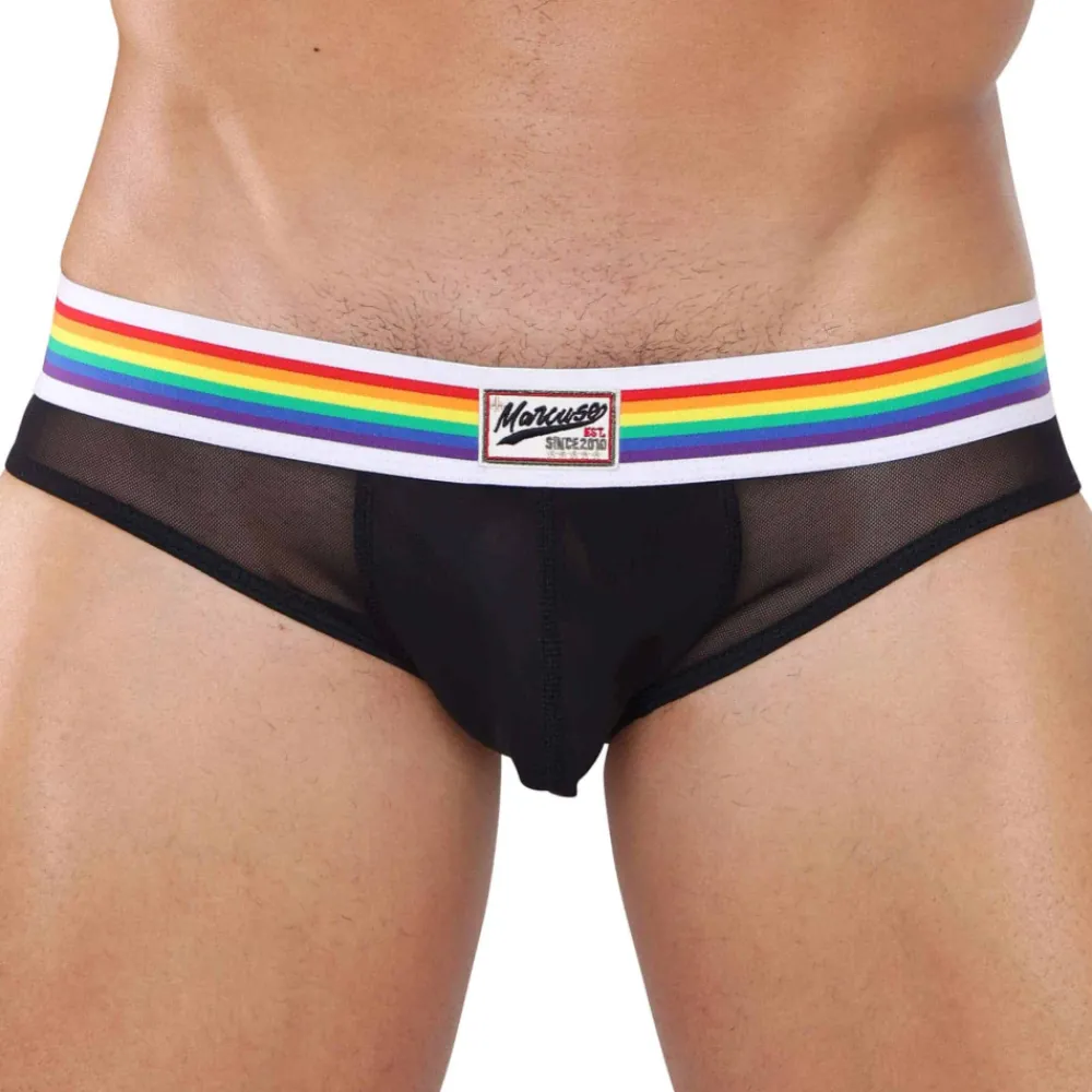 Slip très sexy en résille extensible semi-transparente, légère et respirante. Coupe taille basse ajustée. Ceinture élastique rayée aux couleurs de l’arc-en-ciel. Poche frontale préformée doublée pour plus de maintien. Logo Marcuse brodé sur la fesse droite.