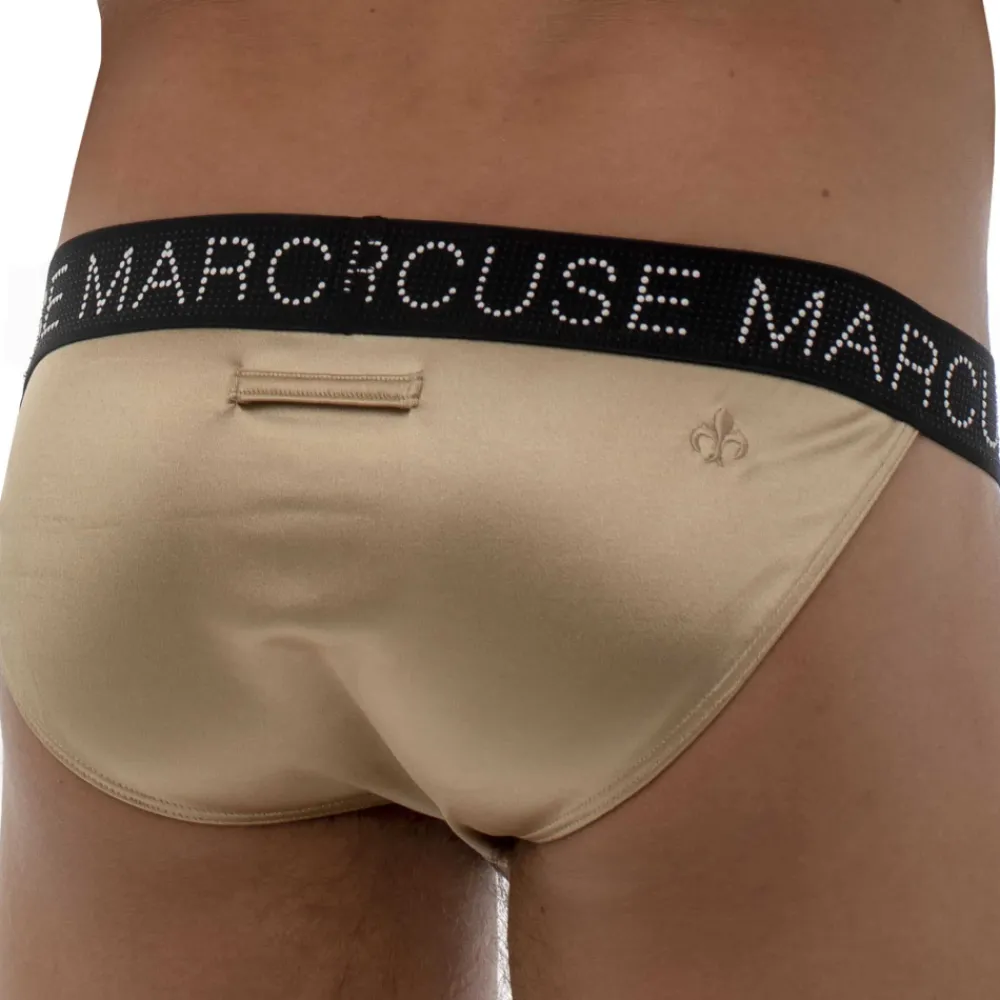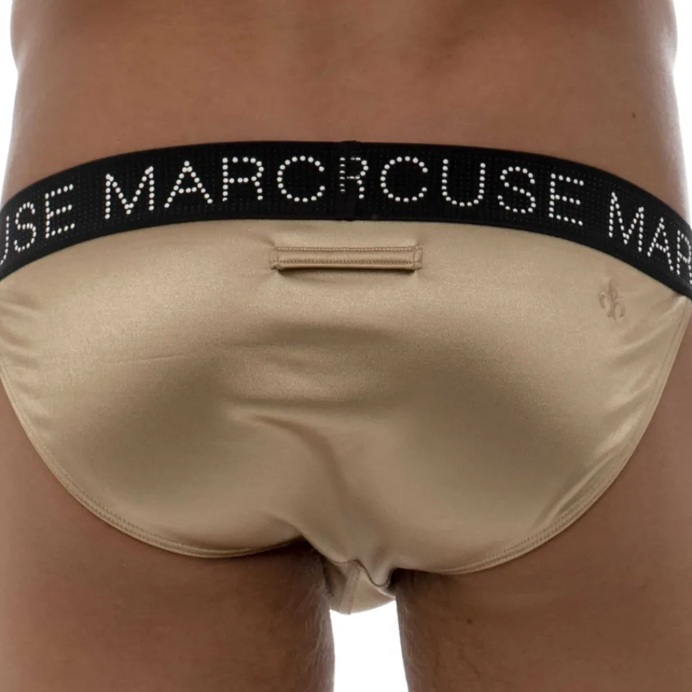 Slip ultra confortable en microfibre stretch, douce et respirante, d’aspect métallique brillant. Coupe tanga super taille basse, courte et ajustée, assurant confort et maintien. Poche frontale 3D non doublée. Logo Marcuse brodé sur la fesse droite. Ceinture élastique signée Marcuse.