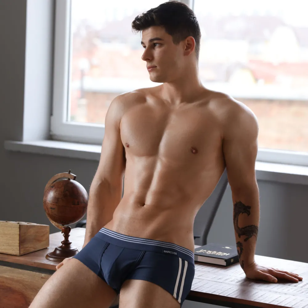 Boxer confortable en microfibre extensible, ultra-douce, légère et respirante. Coupe taille basse et très ajustée. Deux bandes sport contrastées sur les côtés. Poche frontale préformée, non doublée. Ceinture élastique rayée avec étiquette Marcuse en silicone sur la hanche gauche. Logo brodé sur la fesse droite.