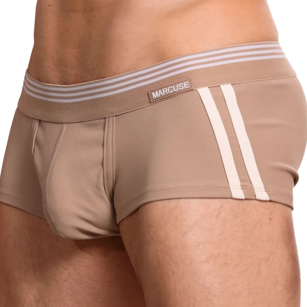 Boxer confortable en microfibre extensible, ultra-douce, légère et respirante. Coupe taille basse et très ajustée. Deux bandes sport contrastées sur les côtés. Poche frontale préformée, non doublée. Ceinture élastique rayée avec étiquette Marcuse en silicone sur la hanche gauche. Logo brodé sur la fesse droite.