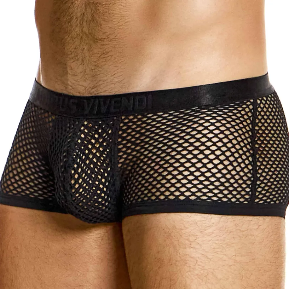Boxer taille basse provocant en résille dont le maillage très large laisse peu de place à l’imagination. Poche frontale doublée. Coupe ajustée et très sexy. Fine ceinture élastique satinée signée Modus Vivendi ton sur ton.