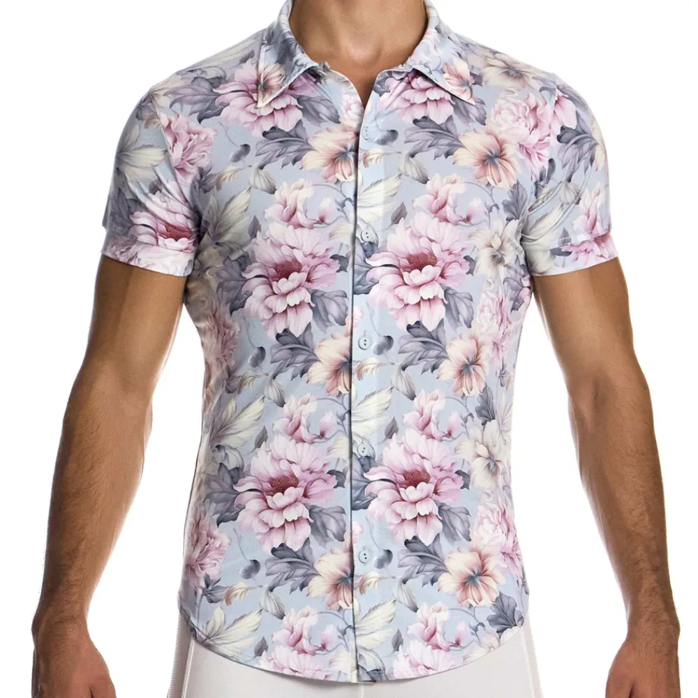 Chemisette sexy et élégante en microfibre extensible très douce et soyeuse. Imprimé floral romantique et délicat de couleur pâle. Coupe cintrée, arrondie en bas pour un tombé parfait sur un jean ou un short. Fermeture par 6 boutons. Logo MV en silicone dans le dos.