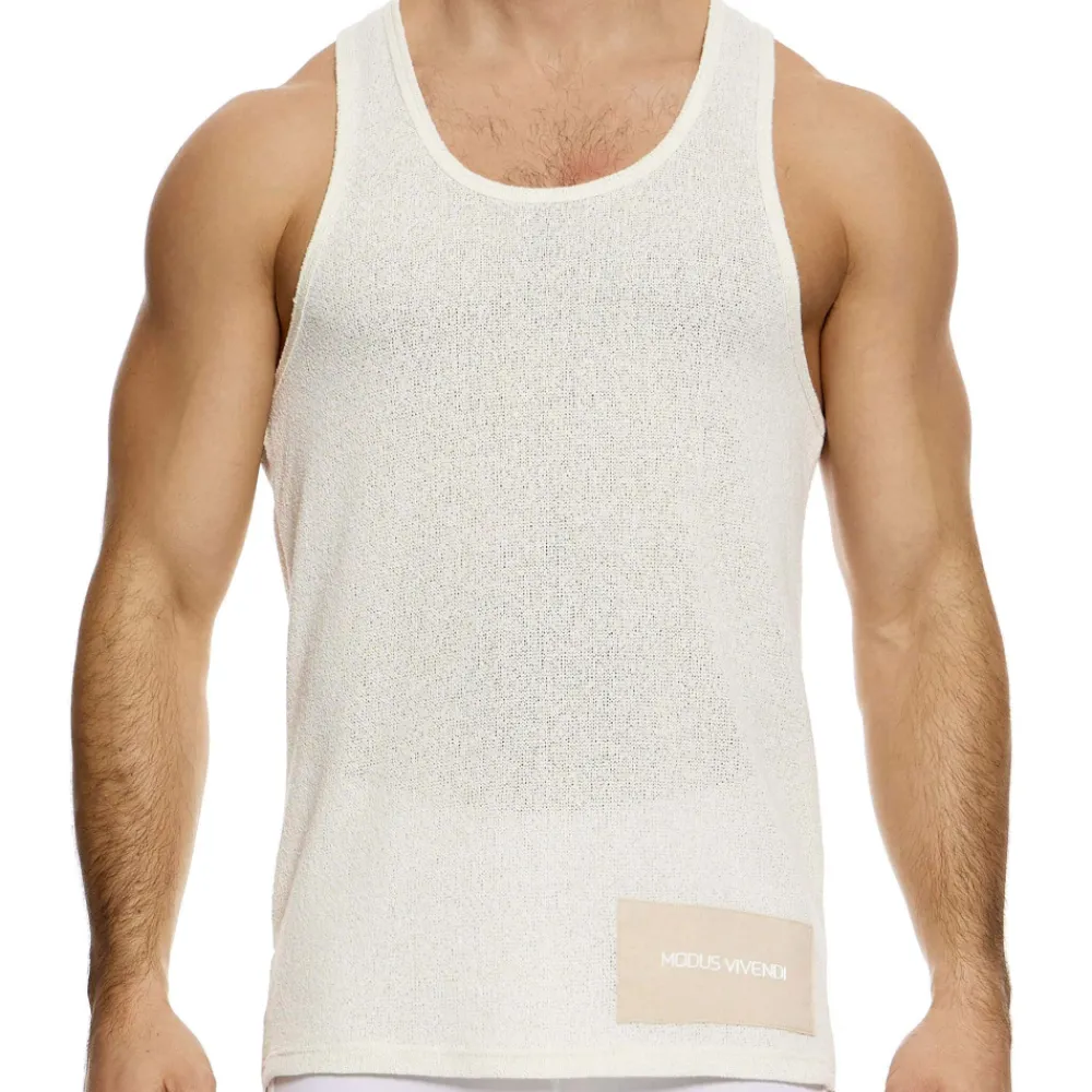 Débardeur monochrome en maille tricotée fine, qui laisse légèrement entrevoir le corps en transparence. Empiècement en tissu plein en haut du dos. Grande étiquette Modus Vivendi Cousue au niveau de la taille. Dos nageur.