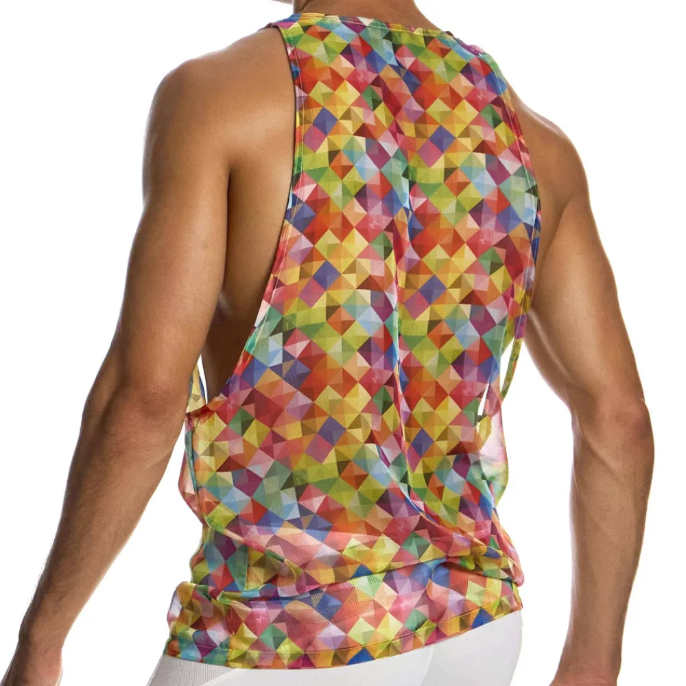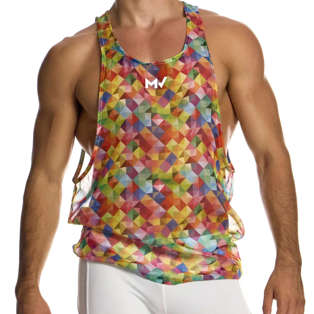Débardeur semi-transparent en mousseline ultra légère, fluide et confortable. Imprimé géométrique aux couleurs de l’arc-en-ciel. Larges ouvertures sous les bras. Coupe ample. Logo MV en silicone sur la poitrine.