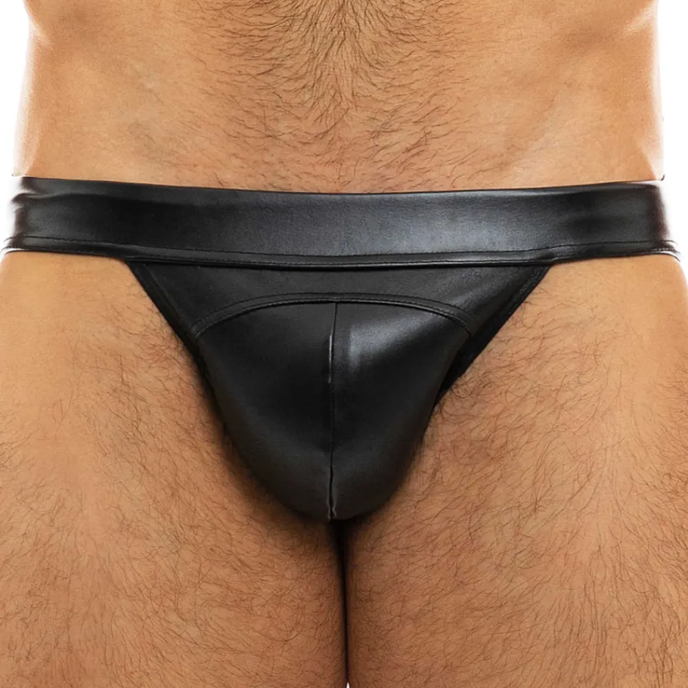 Jockstrap taille basse très sexy et luxueux en microfibre imitant le cuir. Poche frontale doublée. Logo métallique Modus Vivendi sur les fesses. Ceinture élastique recouverte.