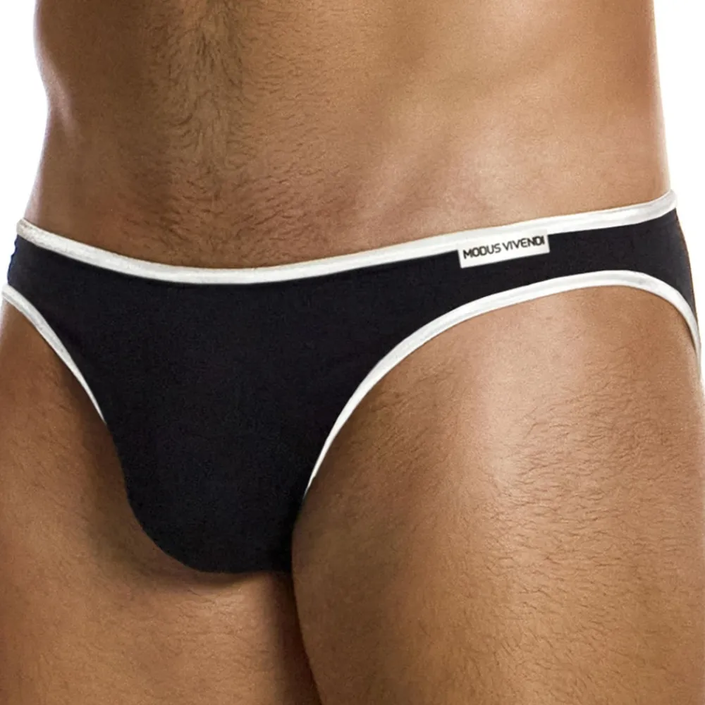 Slip luxueux, élégant et confortable en mélange très doux de soie et de viscose. Coupe taille basse. Poche frontale non doublée. Bordures satinées de couleur contrastée. Etiquette Modus Vivendi en silicone cousue sur la fine ceinture élastique.