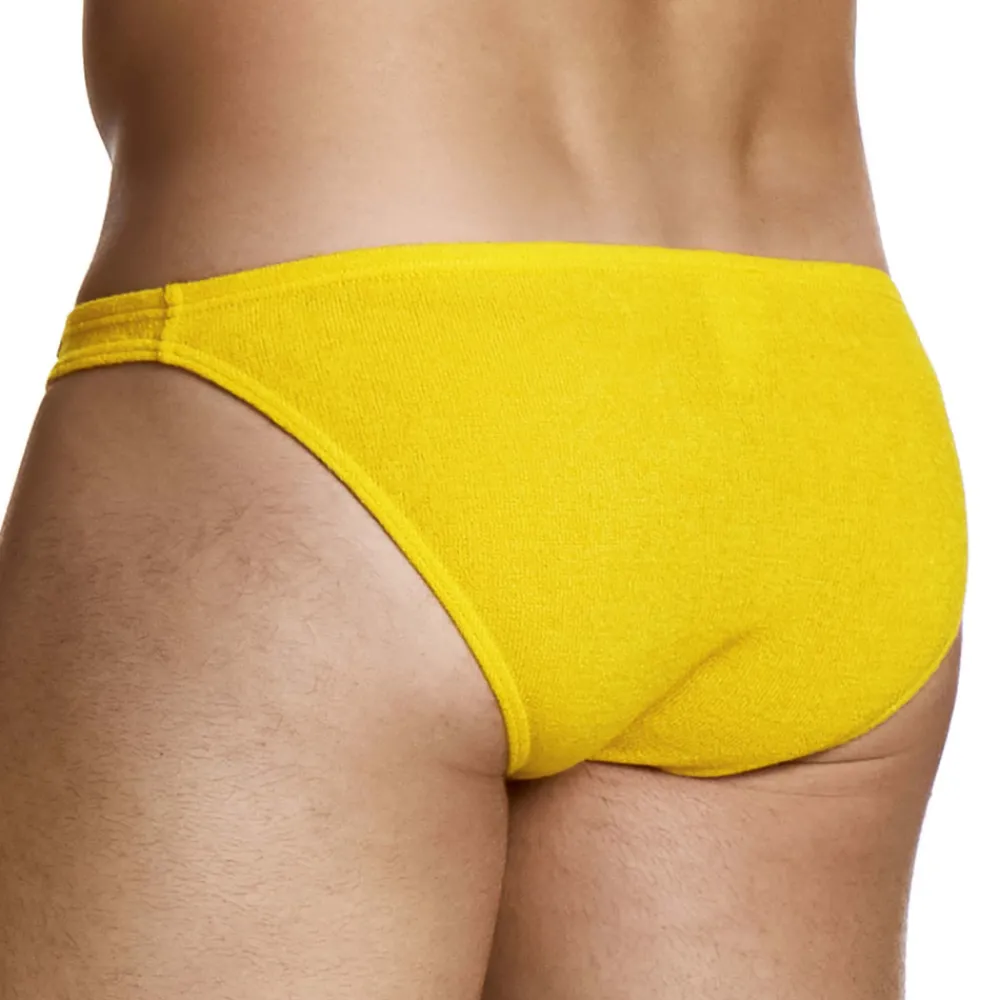 Slip taille basse minimaliste très sexy en tissu bouclette tricoté. Poche frontale non doublée. Etiquette Modus Vivendi sur la fine ceinture élastique recouverte.