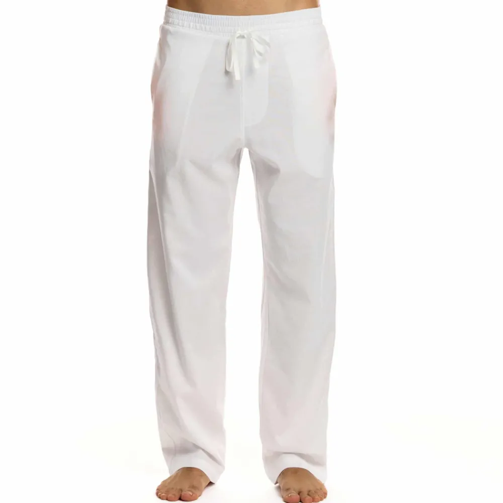 Pantalon droit en tissu léger à base de lin. 3 poches. Ceinture élastique avec cordon de serrage. Etiquette MV cousue à l’arrière.